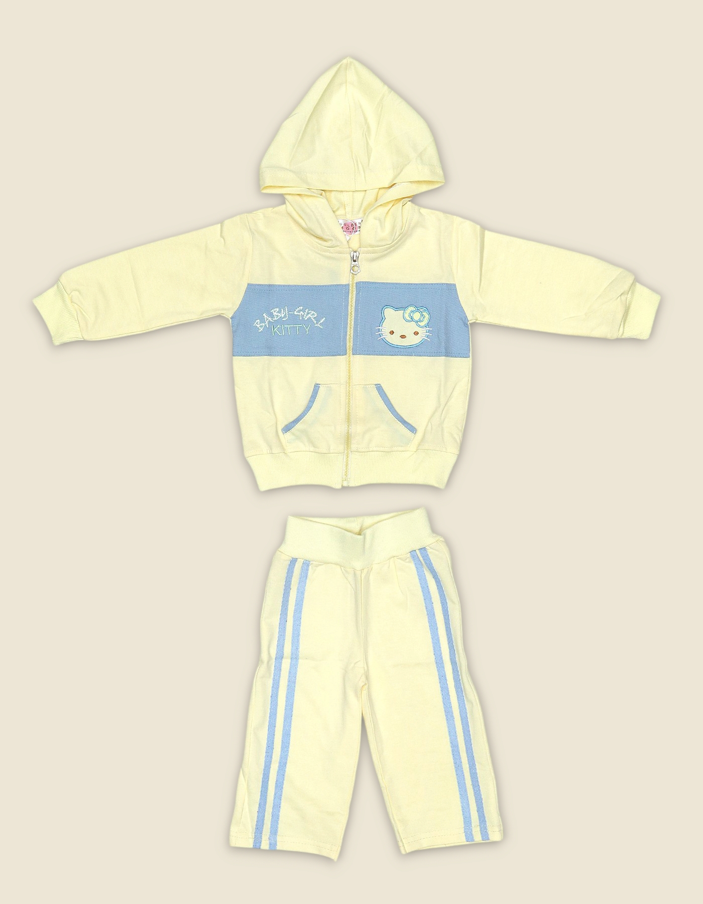 Cute and comfy two piece girls outfit including hooded jacket and matching pants. Designed with Hello Kitty graphics and blue stripe accents for a playful and trendy look.
