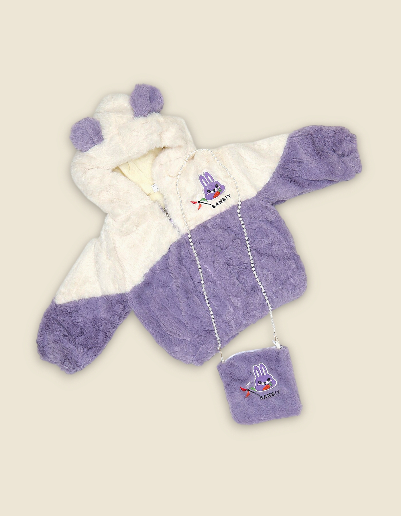 Cozy girls upper hooded jacket with bunny embroidery and matching purse. Perfect for winter wear outings and gifting