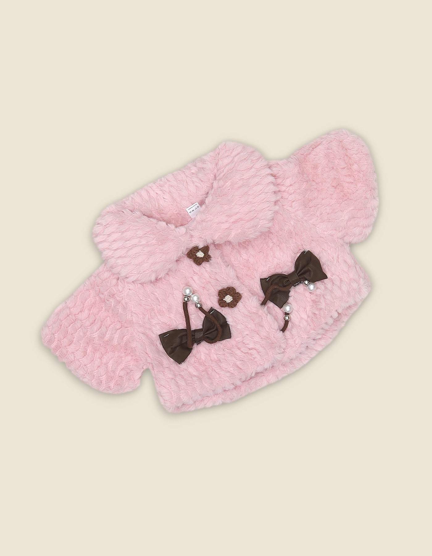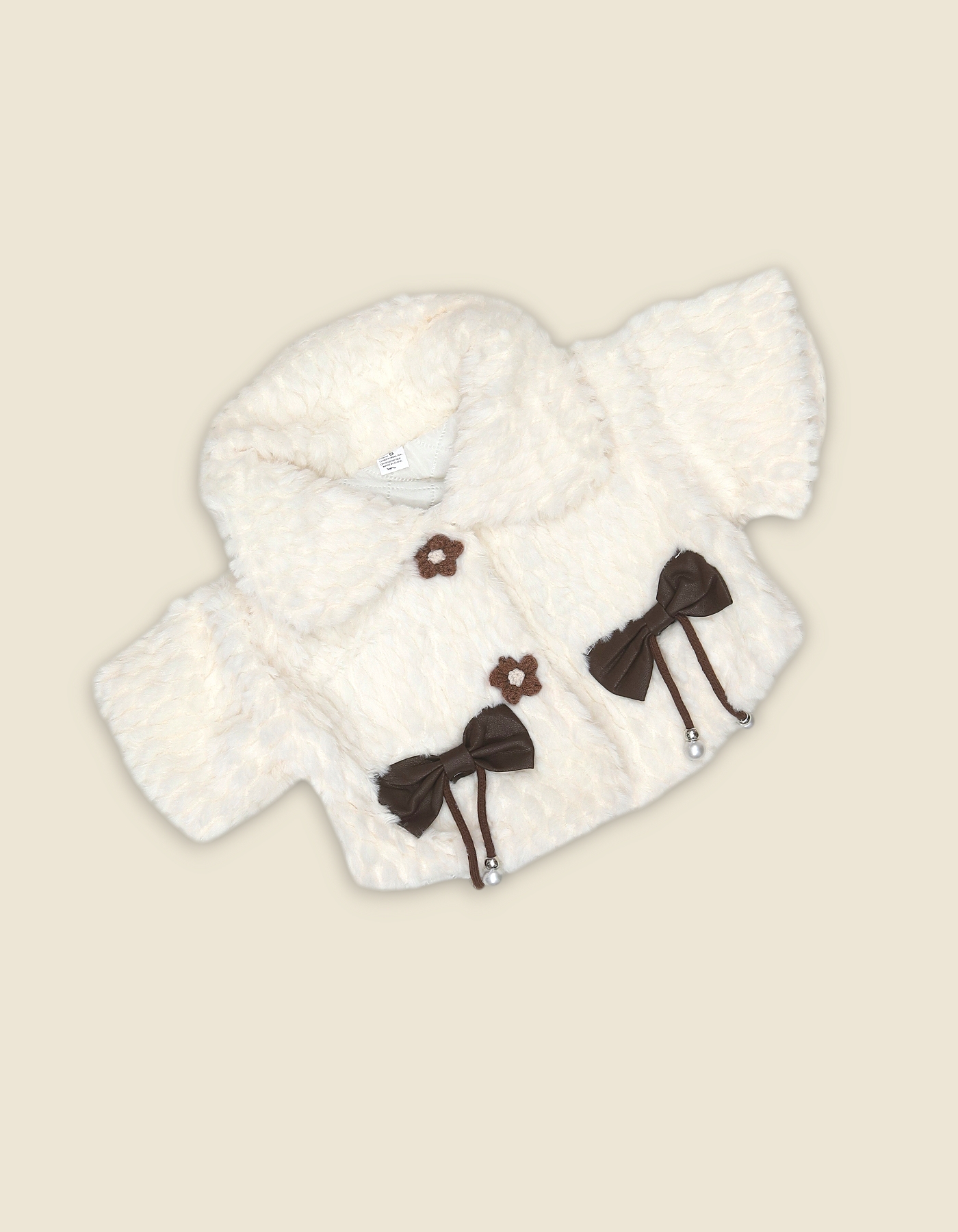Stylish girls upper short sleeve faux fur jacket with decorative bows and flower appliques. Perfect for winter wear outings and gifting