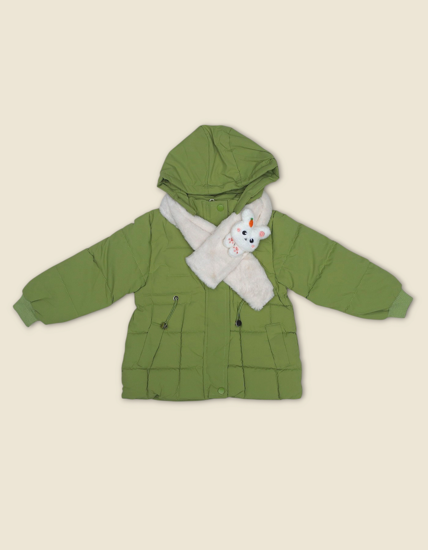 Stylish girls winter jacket with quilted design and plush animal scarf. Perfect for cold weather and gifting