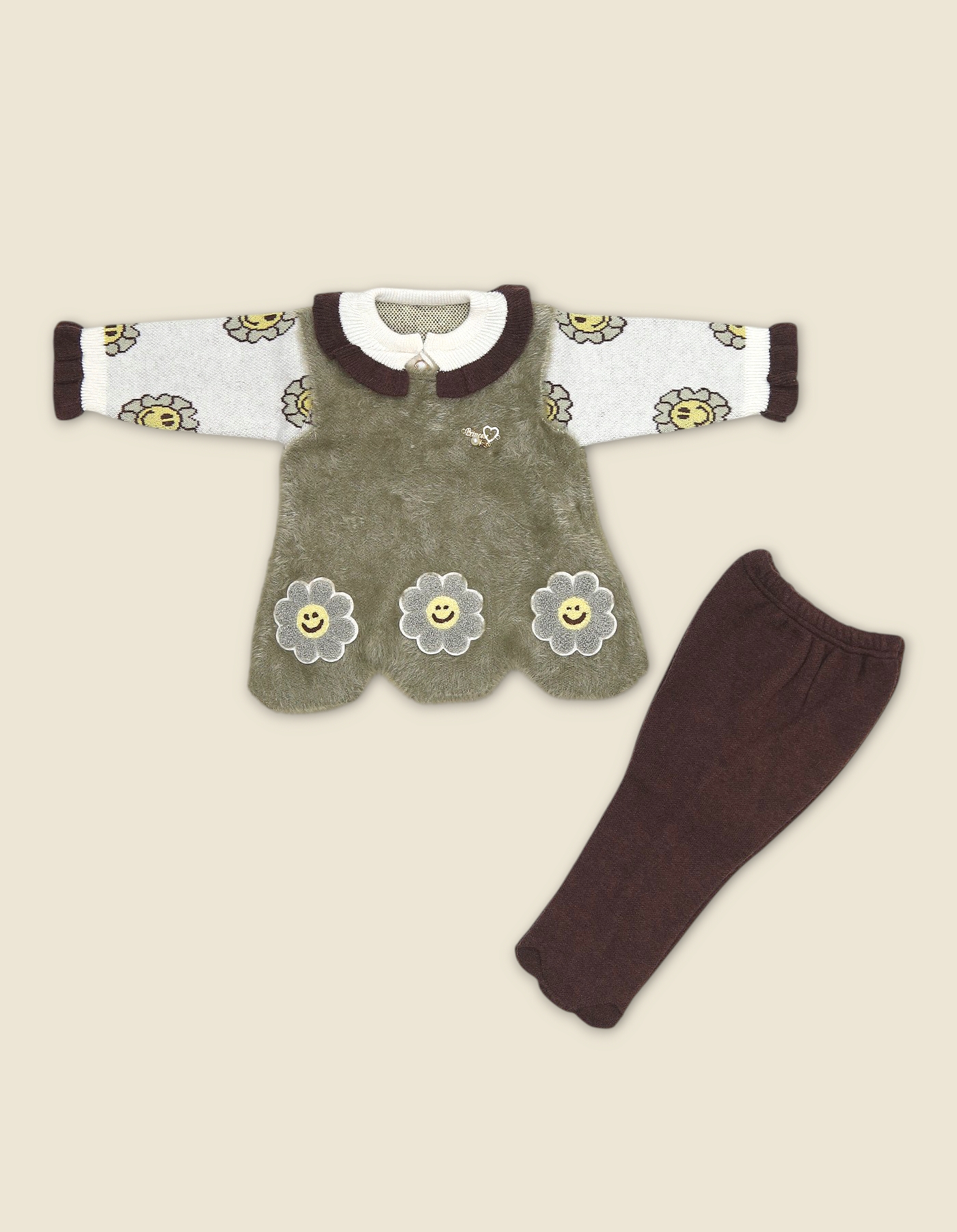 Warm girls woolen suit with fuzzy flower dress and matching pants. Perfect for winter wear and gifting