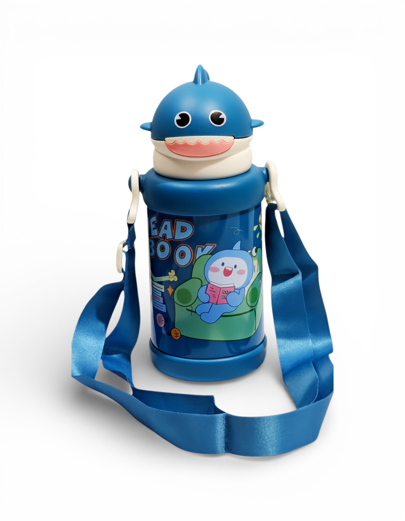 A fun bottle shaped like a friendly shark with a big smile. It has a long strap so kids can take it on adventures.