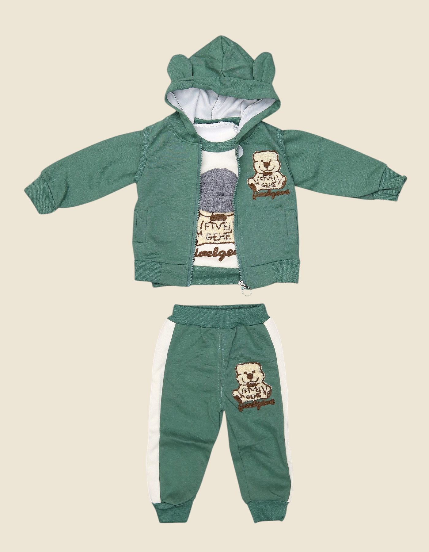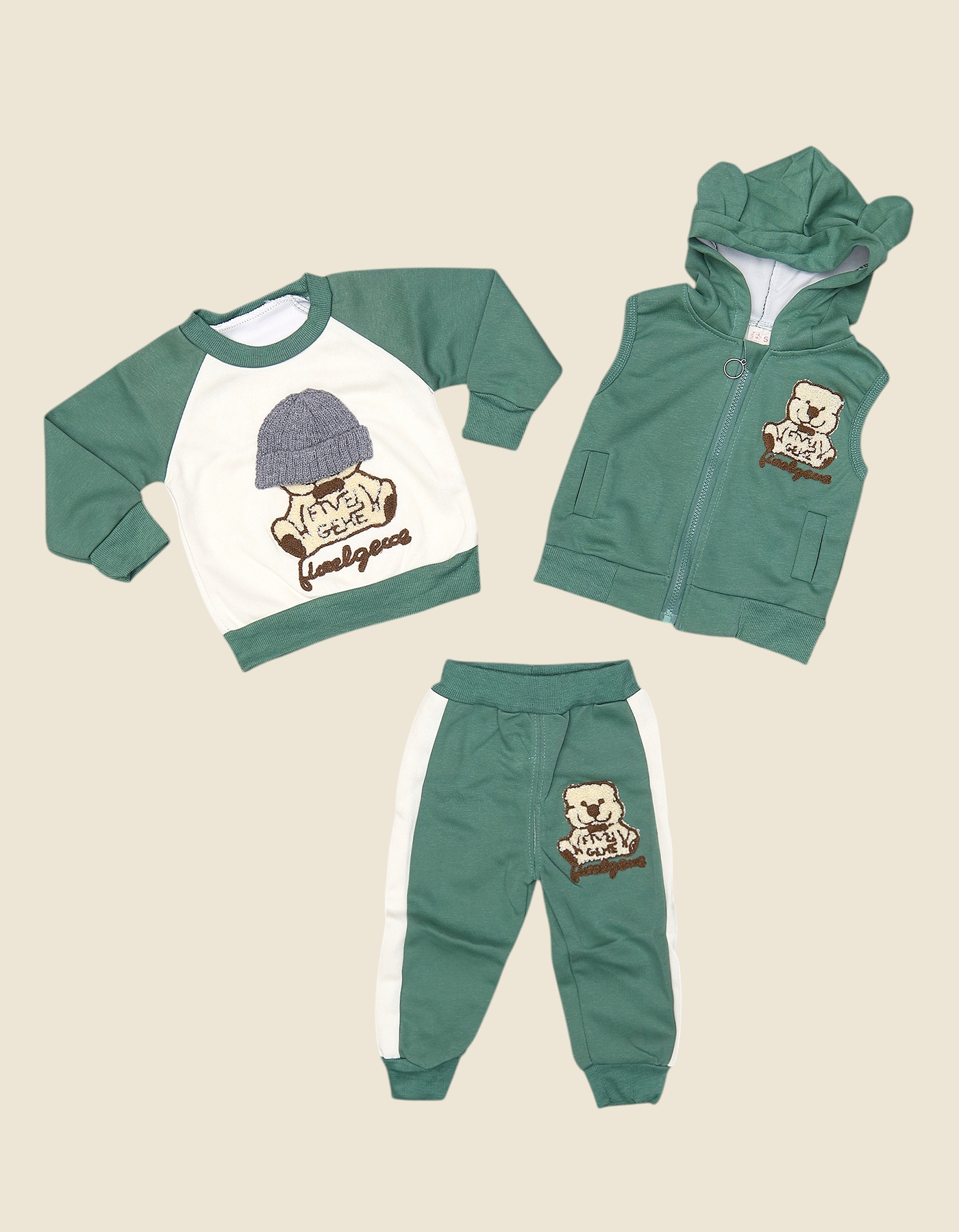 Cute and cozy, this 3-piece boys teddy bear suit is perfect for playful days. The set includes a green hoodie with bear ears, a soft sweatshirt, and jogger pants with a teddy embroidery detail. Designed with comfort and charm in mind, it’s ideal for casual outings, playdates, or everyday wear, keeping your little one warm and stylish.