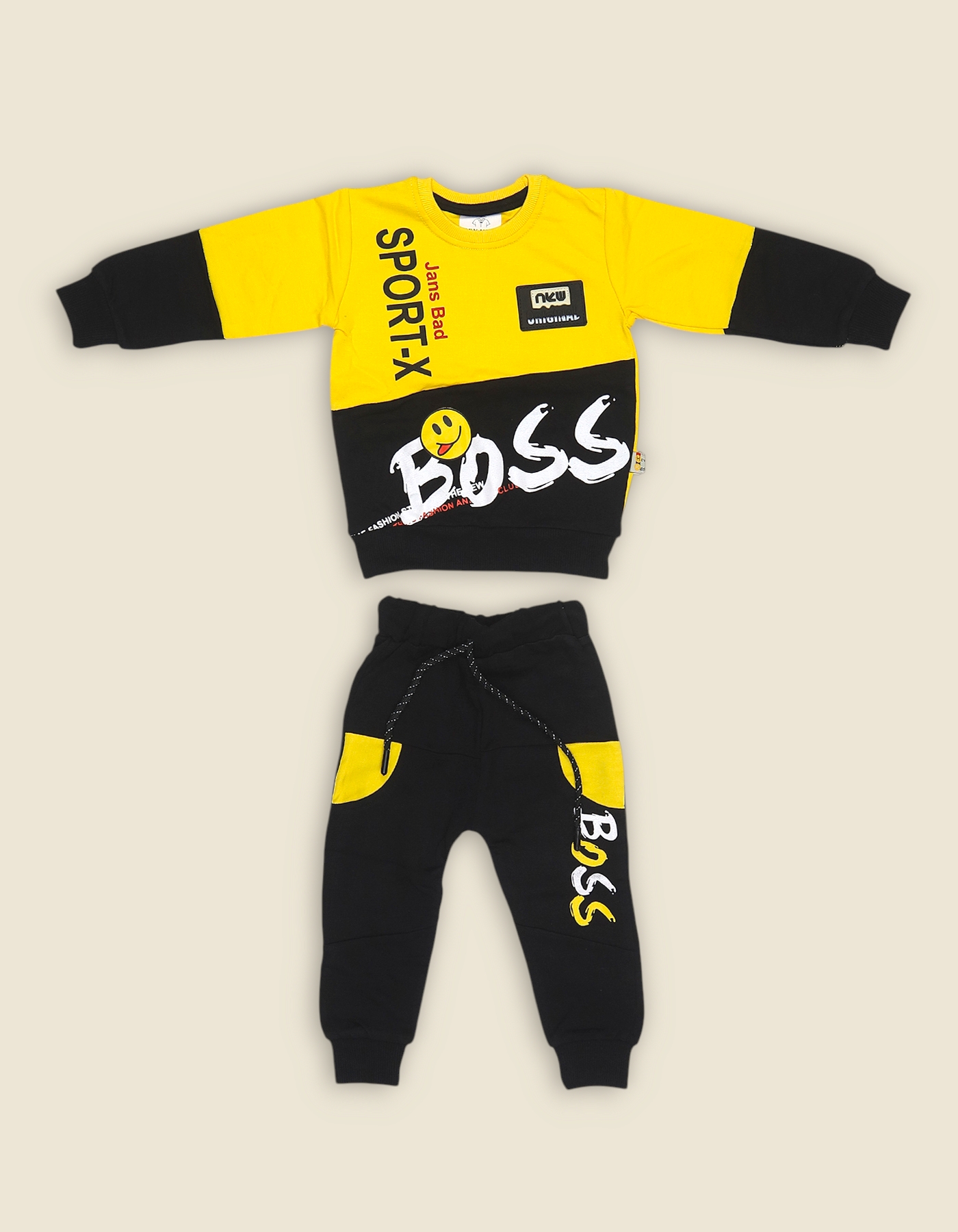 This vibrant color-block set is designed for the little "boss" who loves to stand out. Featuring a bold diagonal design and a playful winking smiley, it’s the ultimate streetwear outfit for active kids.