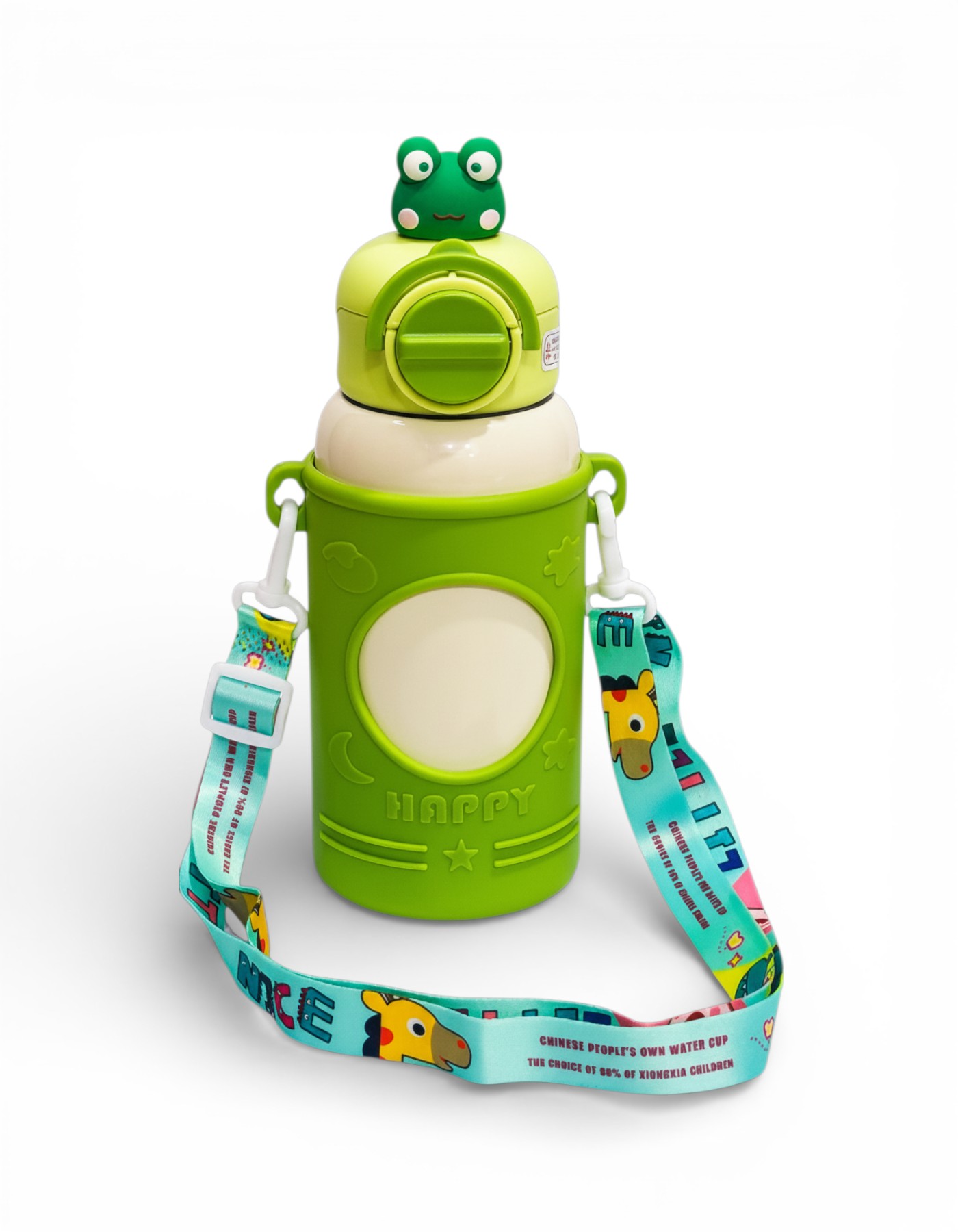 A cute yellow and cream bottle with a happy bunny drawing. It has a big arch handle on top that is perfect for kids to carry.