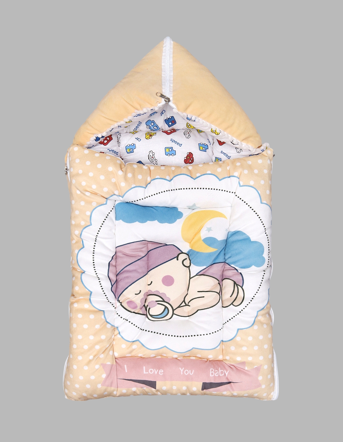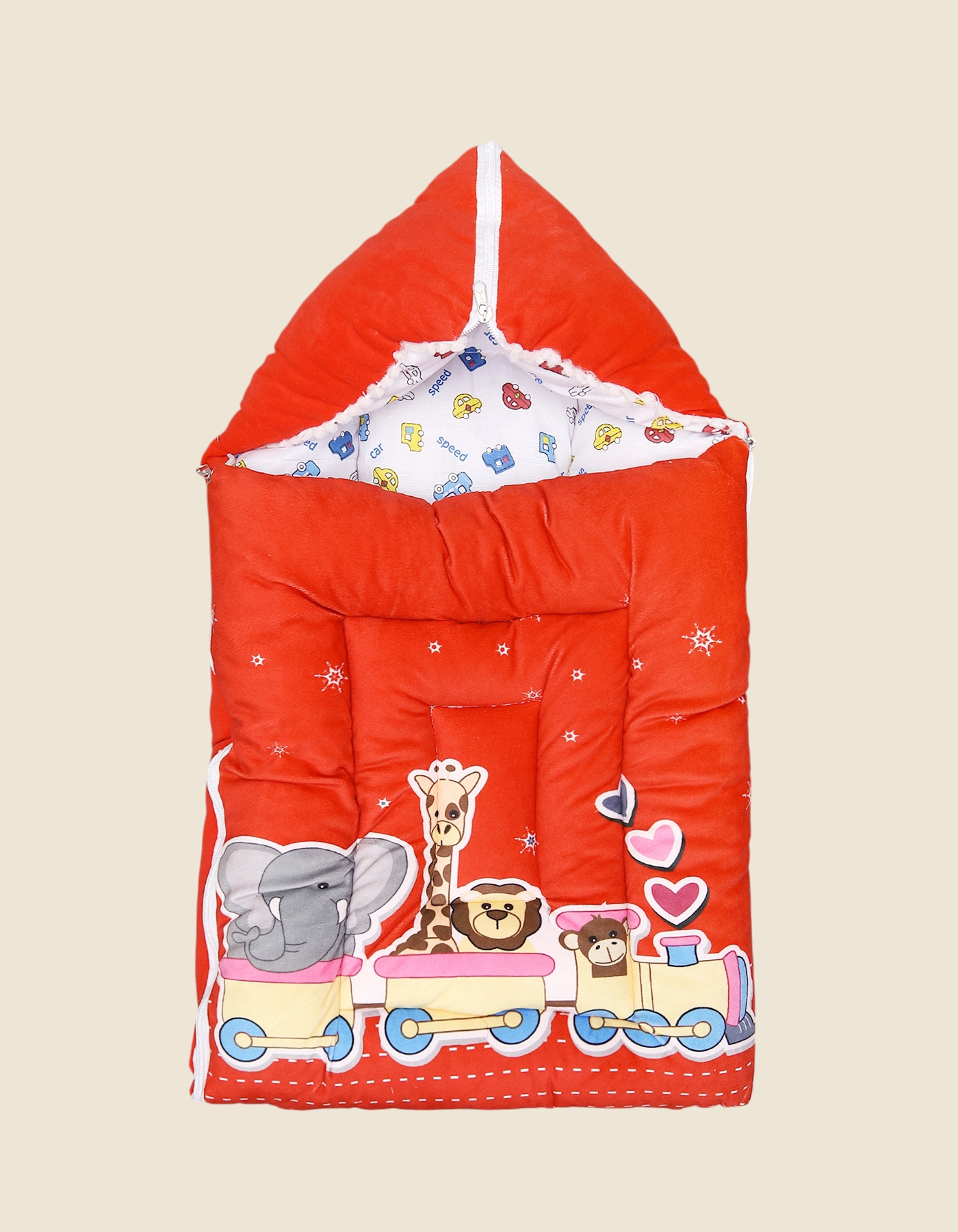 Two hooded, padded baby sleeping bags (footmuffs) with full-zip hoods and playful printed fronts. One features a soft yellow polka background with a sleeping-baby motif and the other a bright red front with a toy-train and animal characters. Both have printed inner linings and are designed to keep newborns and infants warm for stroller rides, naps, and outings.