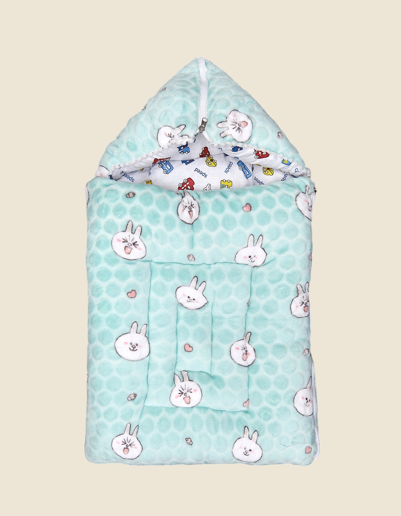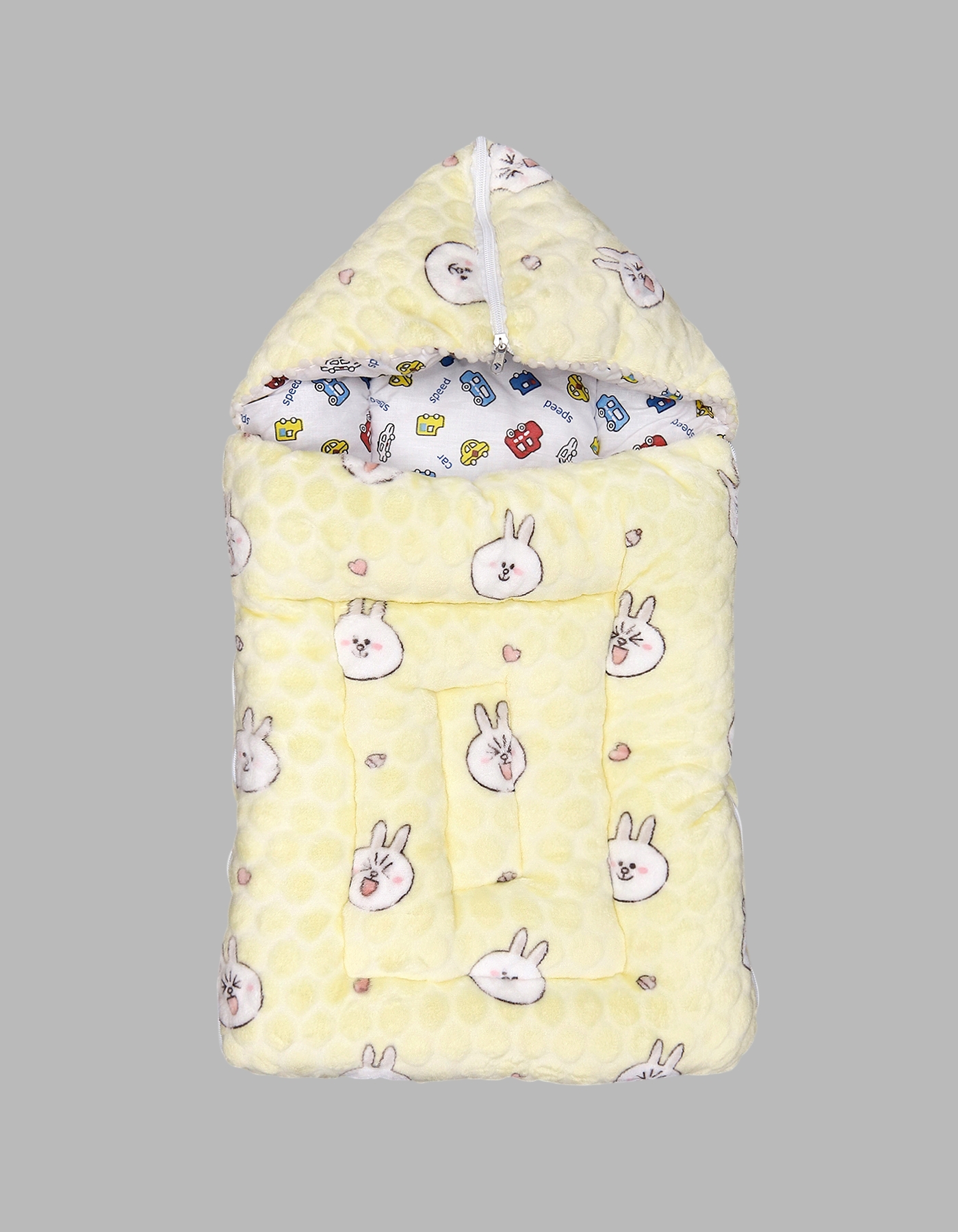 Soft hooded baby sleeping bag with a cute bunny-face print available in pastel pink, mint, and pale yellow. Padded and quilted with a fun printed inner lining, this cozy footmuff is made to keep newborns and infants warm for stroller rides, naps, and short outings.