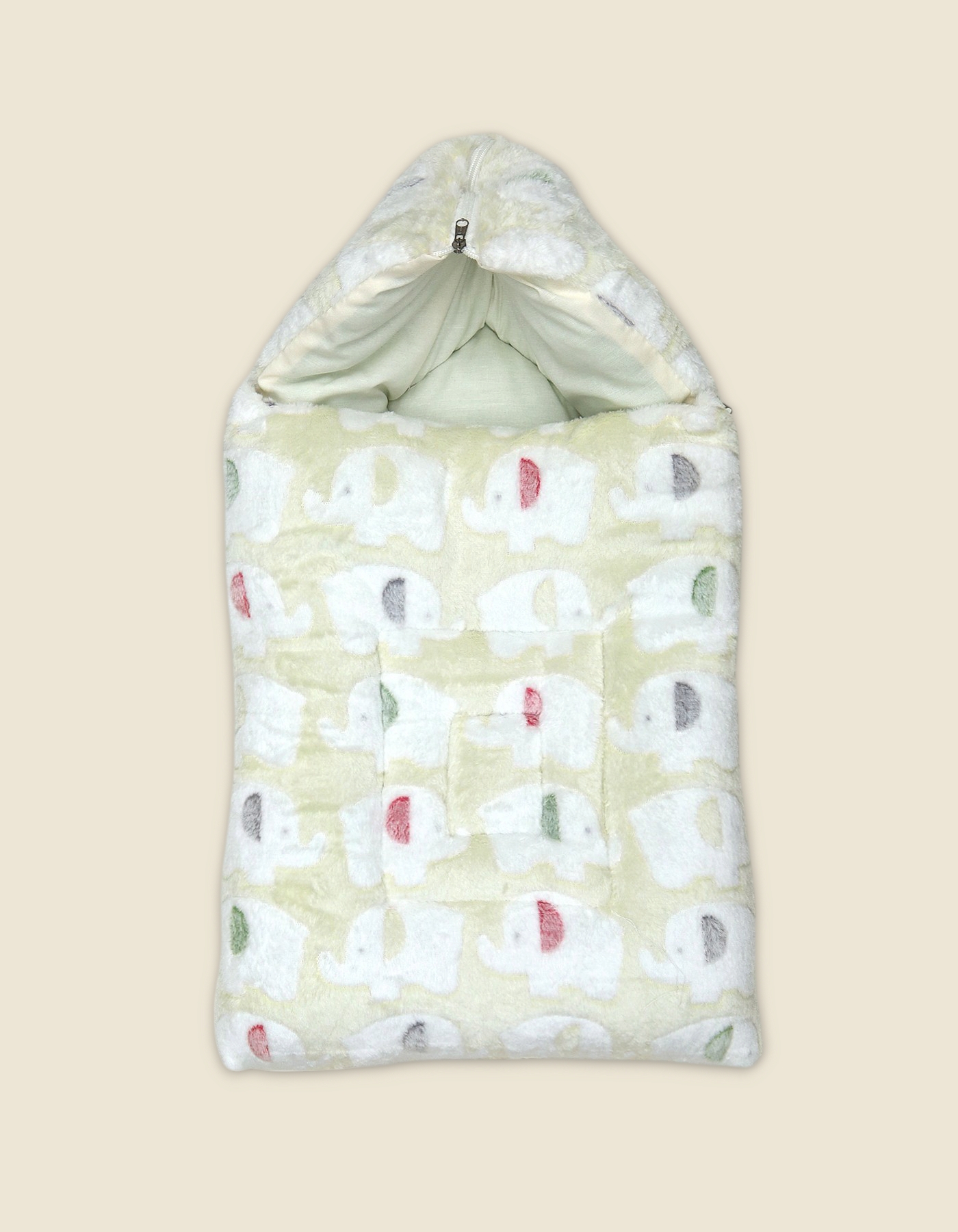 Soft hooded baby sleeping bag with an all-over white elephant motif on pastel backgrounds — available in pink, baby blue, and cream. Quilted and plush with a shaped head area and full-zip hood for easy access. Ideal for newborns and infants during stroller rides, naps, or short outings.