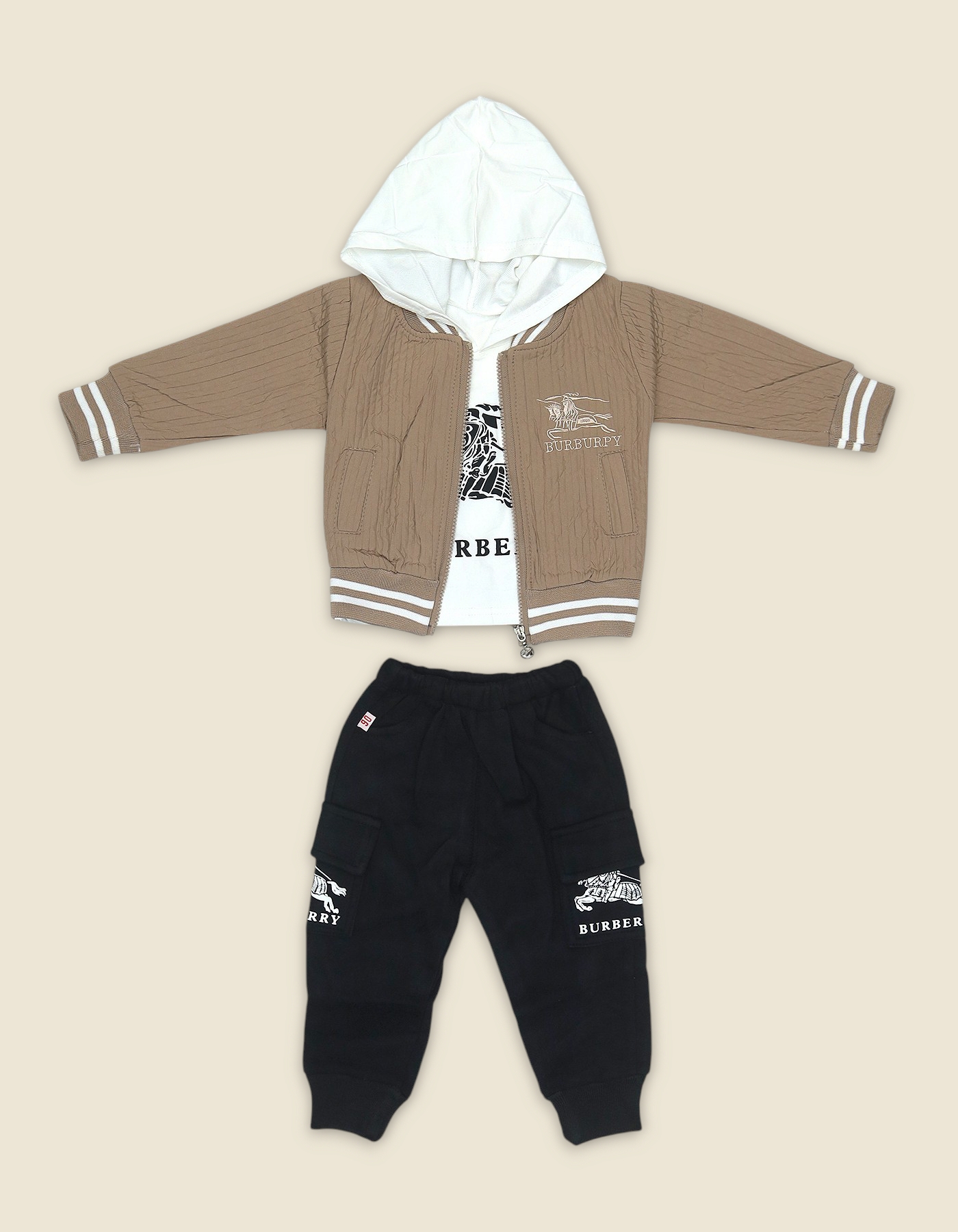 Three-piece kids outfit featuring a lightweight quilted bomber-style jacket with a white hood, a white graphic tee, and black cargo joggers. Sporty-ribbed trims, cargo pockets and logo/graphic prints create a polished yet play-ready set.