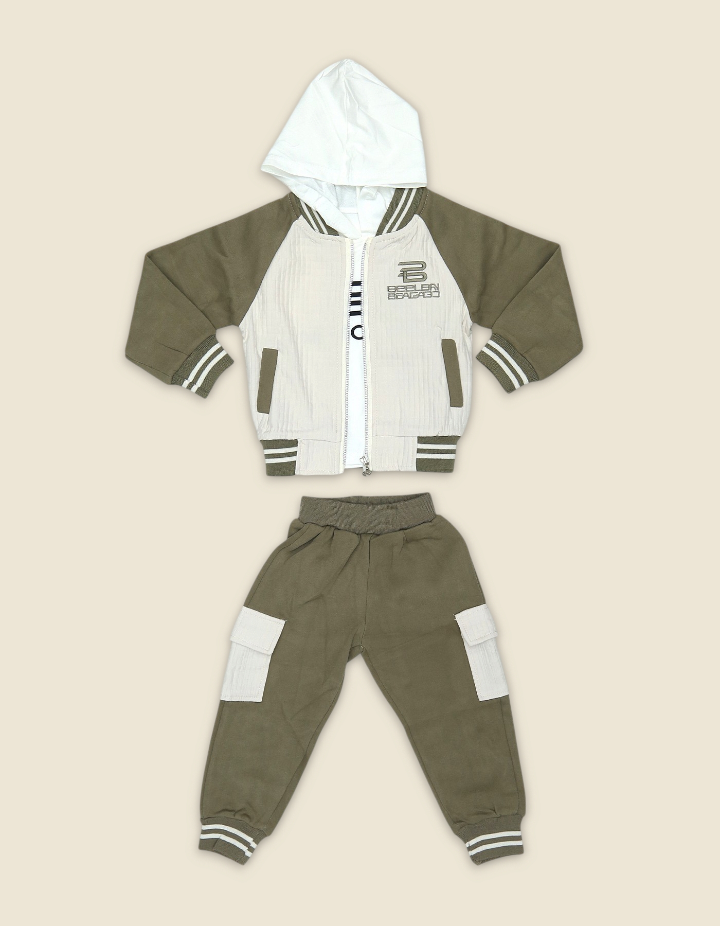 Soft hooded jacket with front zip and contrasting sleeves paired with cargo joggers with elastic waist and ribbed ankles. Two tone design in olive and cream. Comfortable and practical everyday outfit for toddlers and young kids.