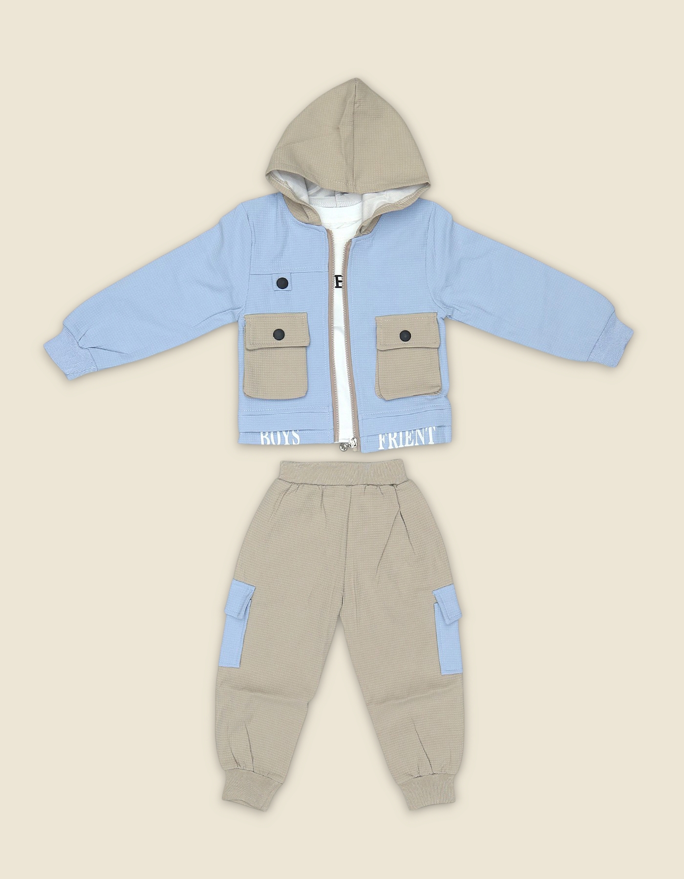 Soft hooded jacket with front snap flap pockets paired with cargo style joggers with elastic waist and ribbed ankles. Two tone design in blue and beige. Comfortable and practical everyday outfit for toddlers and young kids.
