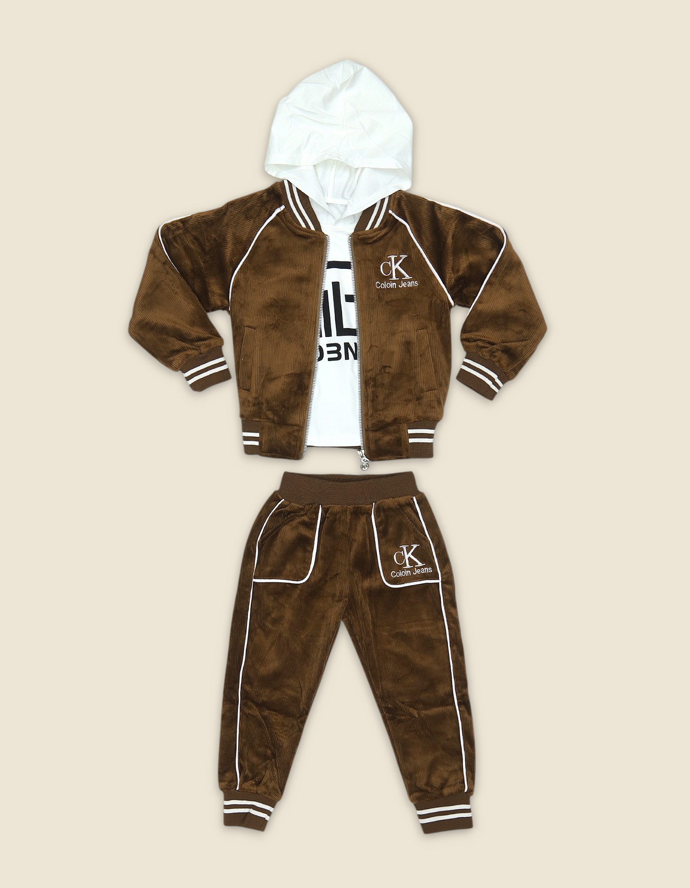 Two piece set with a hooded zip jacket and matching joggers in soft corduroy style fabric. Brown with white contrast piping and hood, featuring chest and pant logo print. Comfortable everyday outfit for toddlers and young kids.