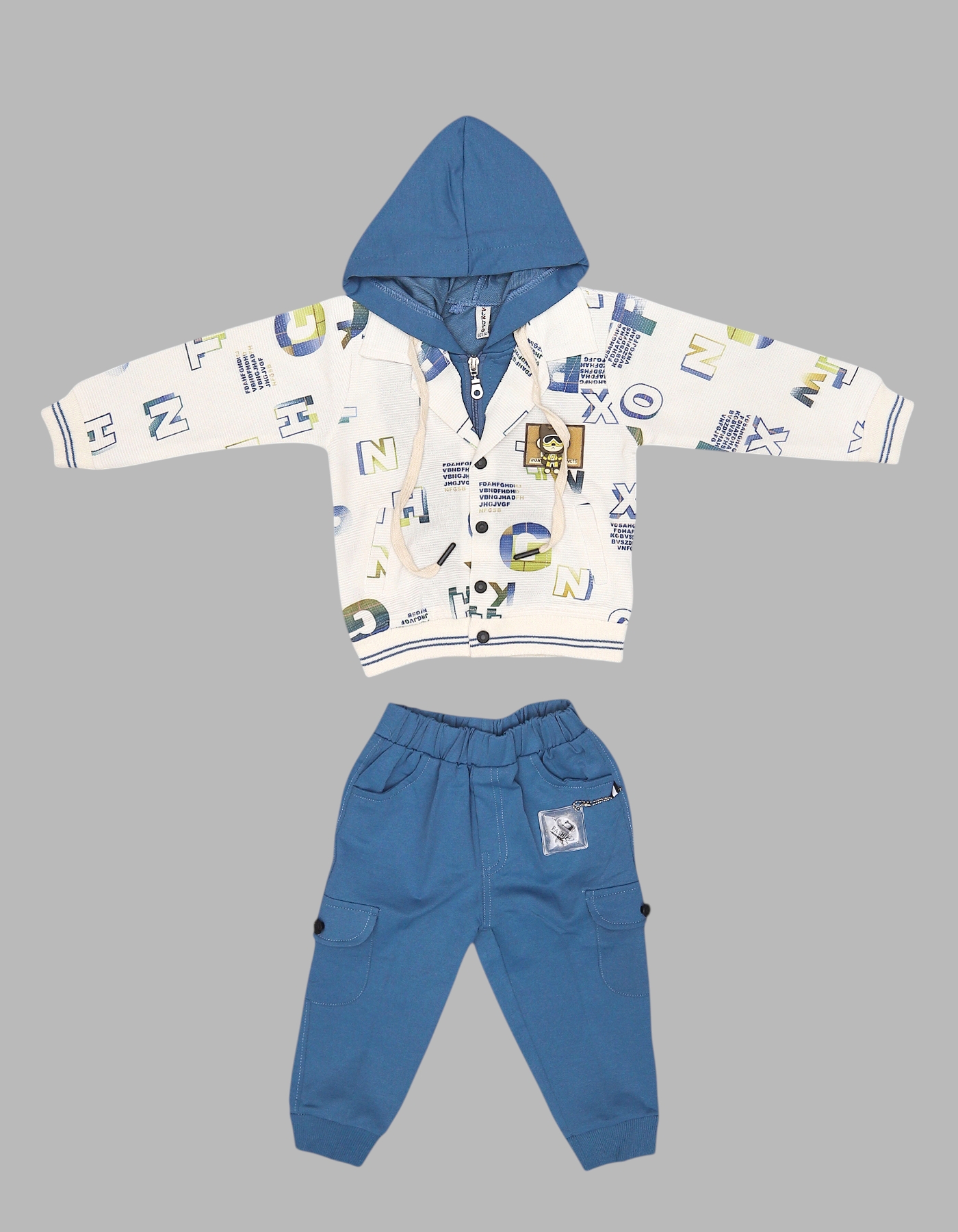Two piece kids set with a hooded printed jacket featuring zip placket and drawcord, paired with blue cargo-style joggers with elastic waist. Lightweight, playful and easy to wear for everyday play.