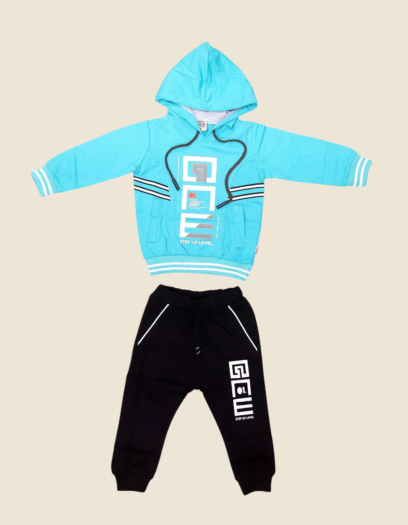 Soft hooded sweatshirt with front pocket and contrast stripe detail paired with elastic waist joggers. Available in blue red and yellow tops with black joggers. Sporty comfortable everyday wear for kids.