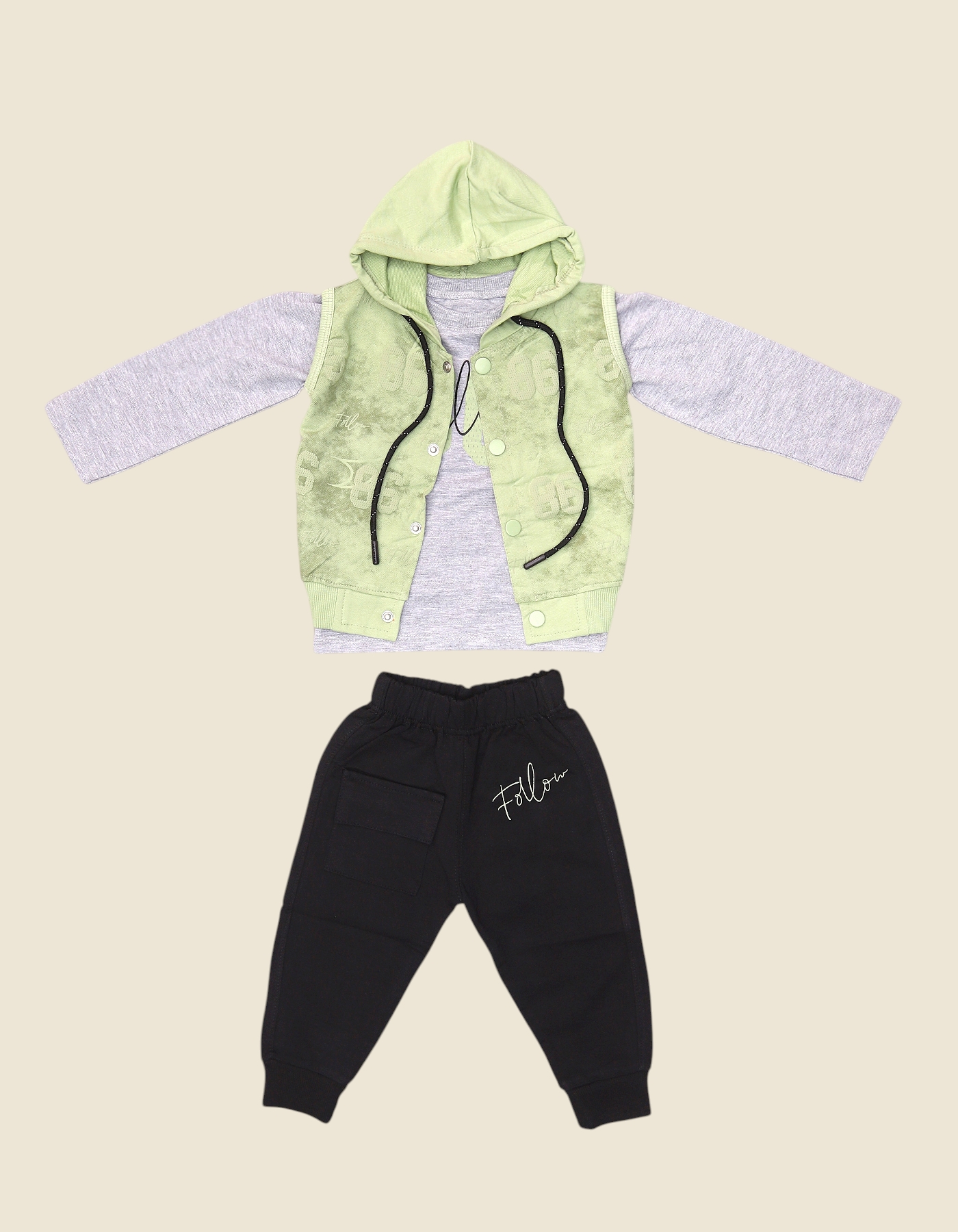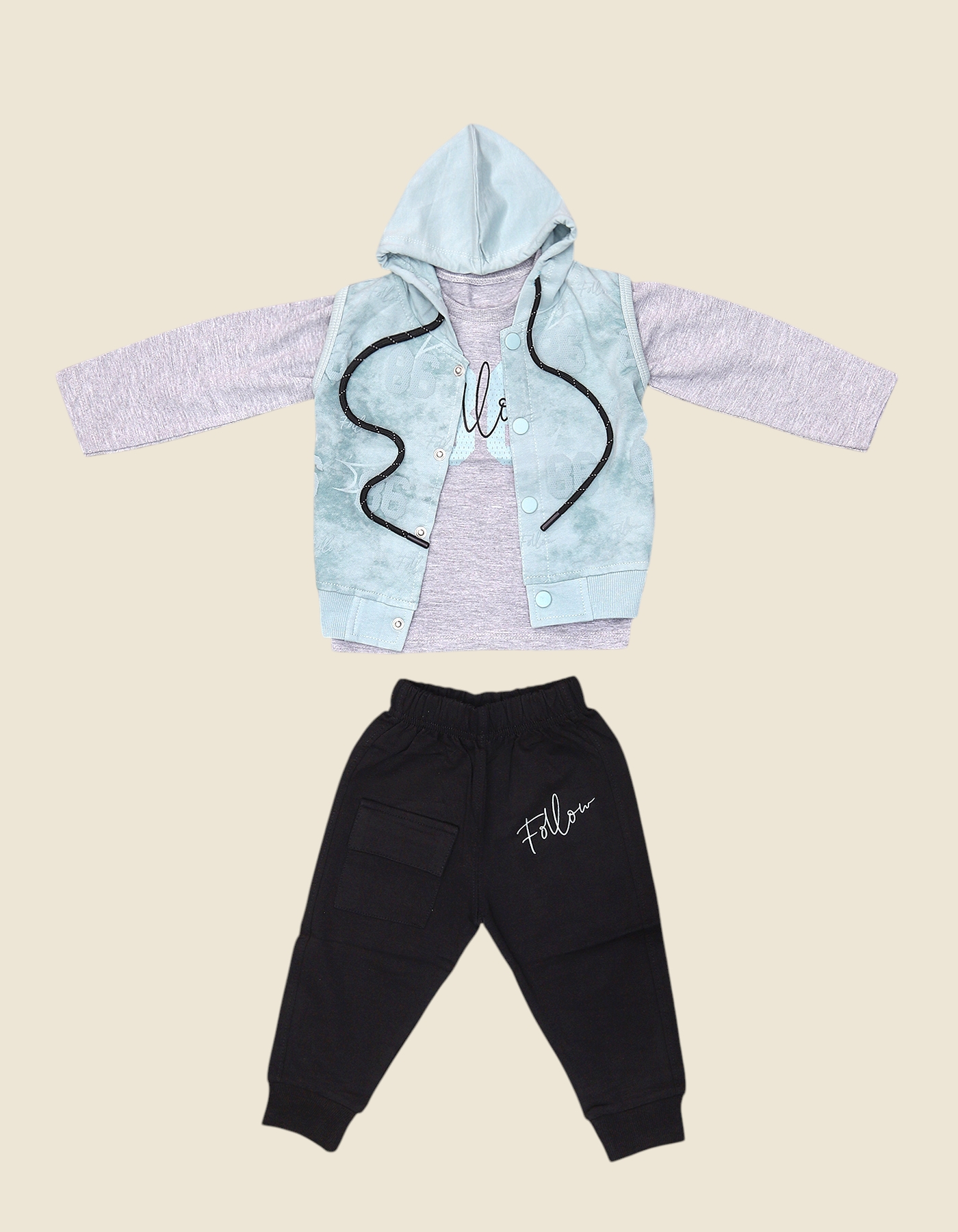 Three piece children set with a hooded sleeveless vest layered over a grey long sleeve tee, plus black cargo style joggers. Pastel washed vest options (mint, beige, pale blue) with contrasting black drawcords and a script Follow print on the jogger thigh. Cozy, layered look that is easy to wear.
