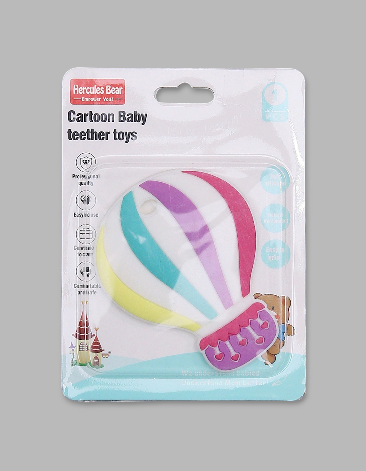 The Hercules Bear Hot Air Balloon Baby Teether is a colorful and fun teething toy designed to soothe sore gums while keeping your little one entertained. Shaped like a playful hot air balloon, it engages babies visually while providing gentle relief during the teething phase. Made from soft, food-grade, BPA-free silicone, this teether is completely safe for chewing and is gentle on delicate gums. The lightweight, easy-to-grip design is perfect for small hands, encouraging babies to hold, chew, and self-soothe independently. The bright multicolor design stimulates sensory development and makes teething time more cheerful.