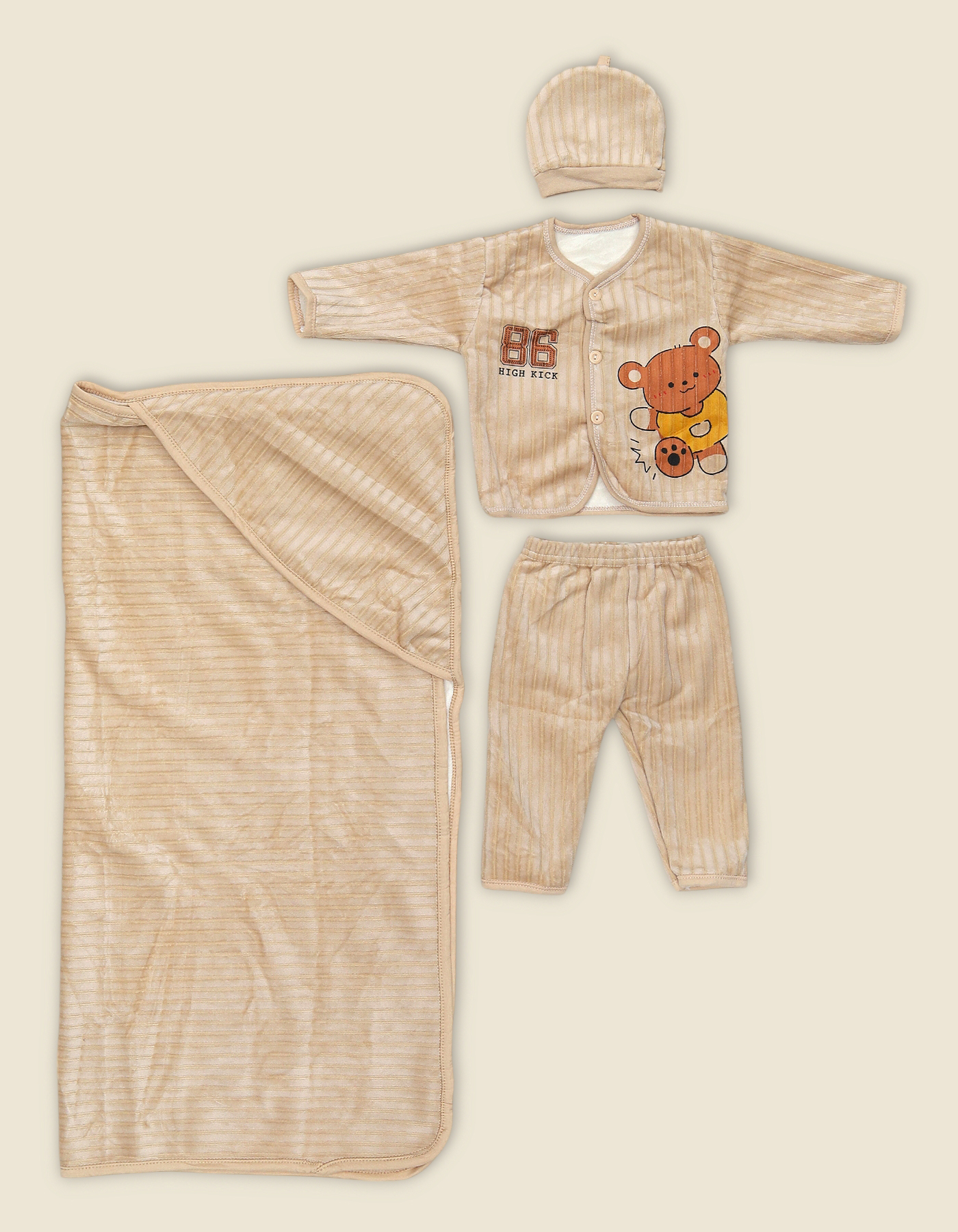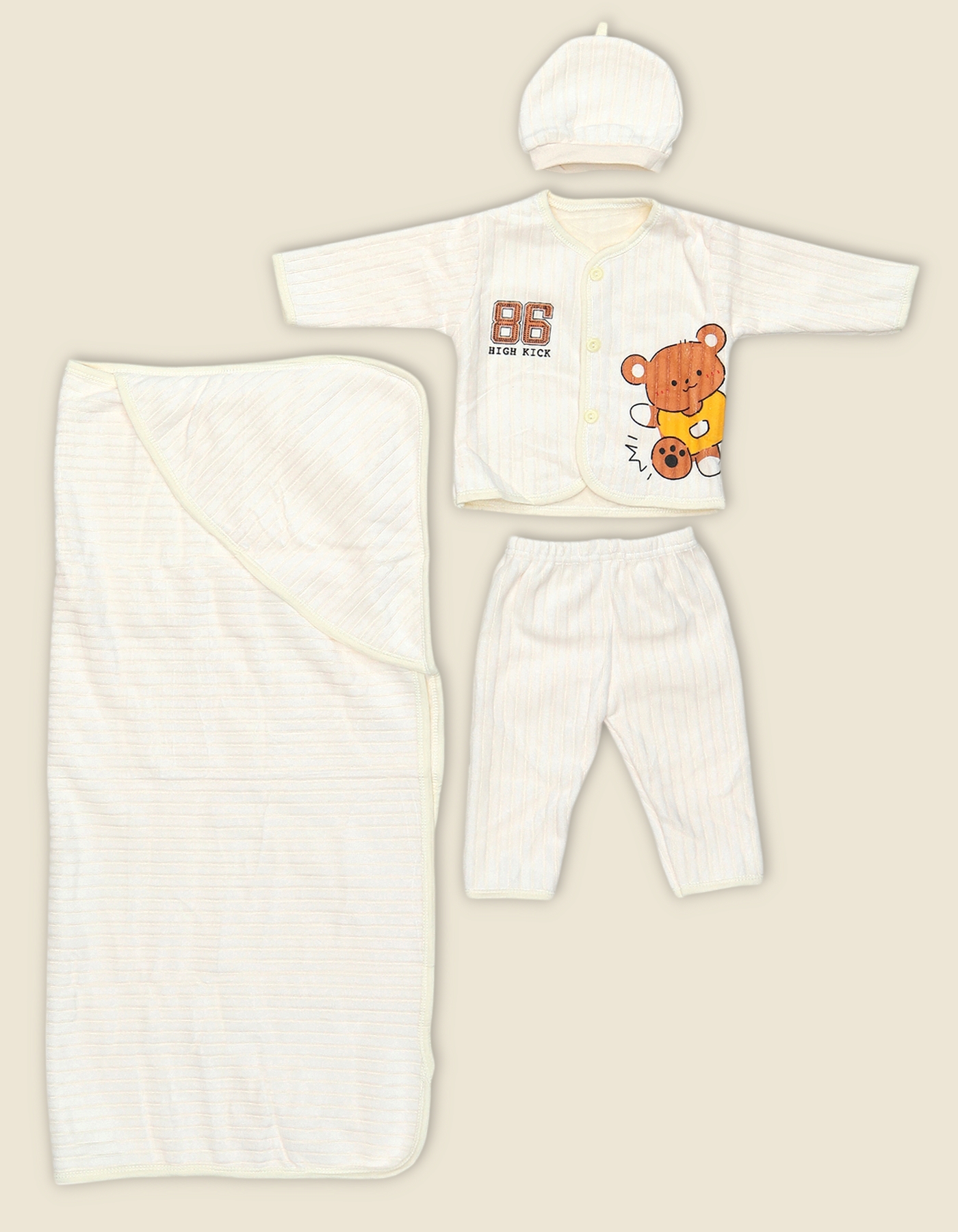 Adorable four-piece baby clothing set in cream with bear print and “At Our Block 88” design. Includes shirt, pants, hat, and blanket. Soft fabric ensures comfort and warmth for newborns.