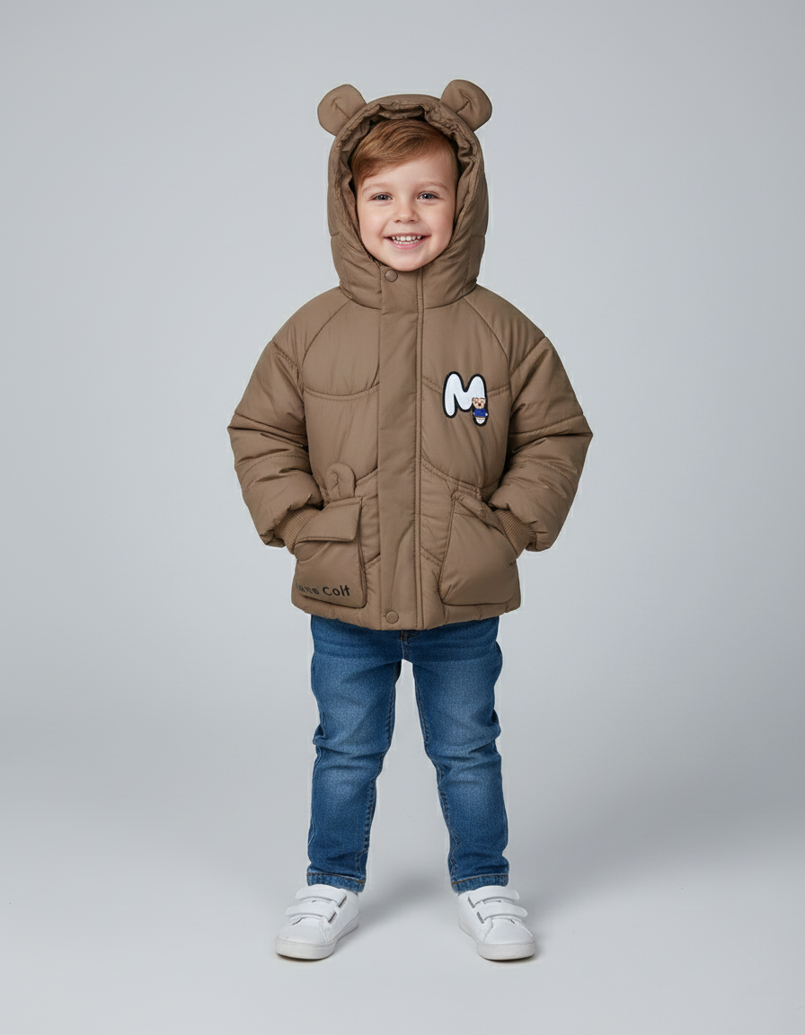 Make winter extra adorable with our Kids Bear Ear Winter Puffer Jacket in soft Brown. Designed with cozy padding, a cute bear-ear hood, and playful front detailing, this jacket brings warmth and charm together. Perfect for toddlers and young kids who love fun winter outfits