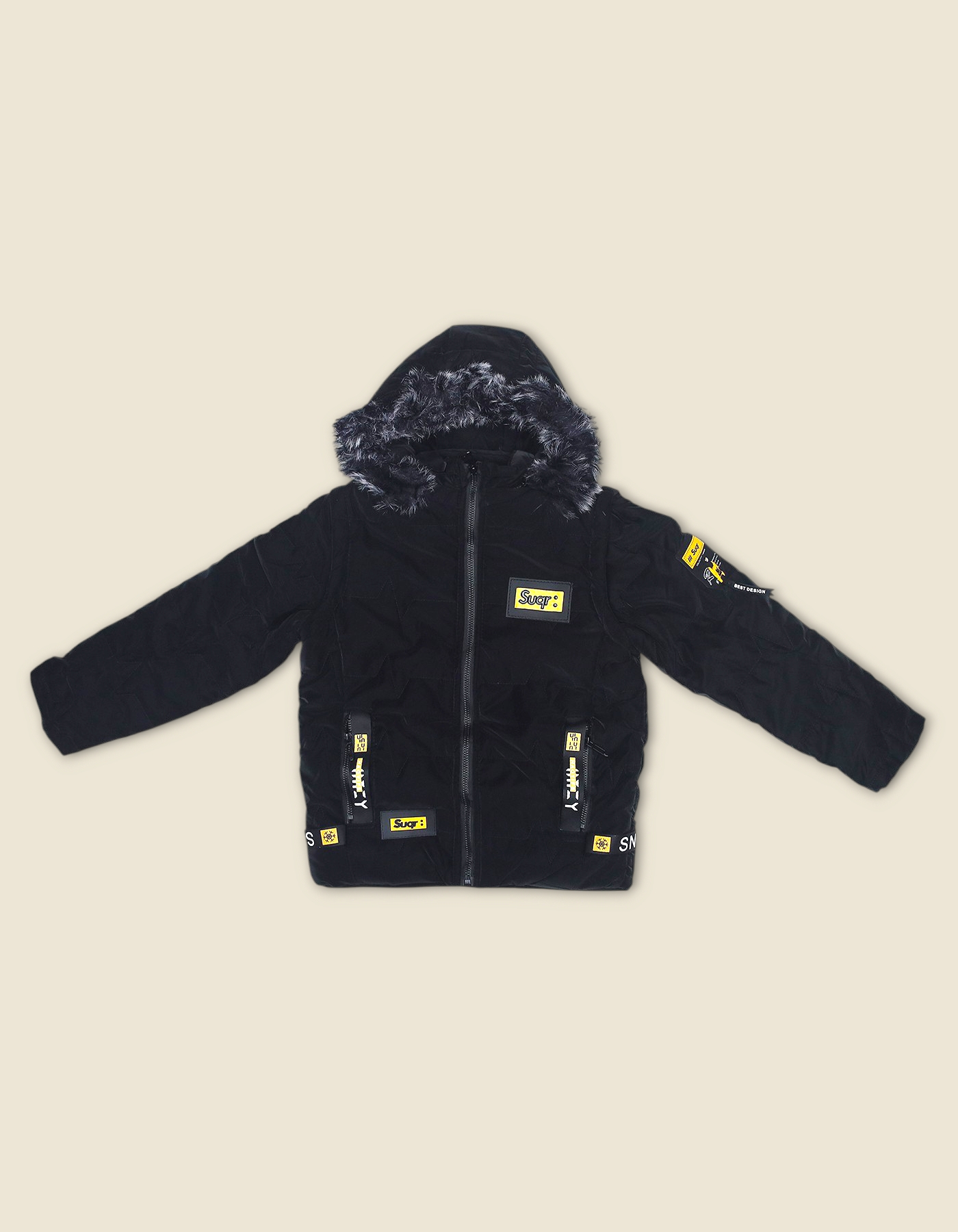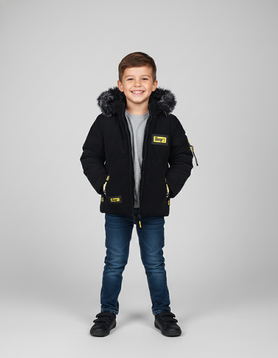 Give your child a warm and stylish winter look with our Kids Fur Hood Winter Puffer Jacket in classic Black, featuring trendy yellow patch detailing. The soft faux-fur hood adds extra warmth and style, while the padded interior keeps your little one cozy during cold days. Perfect for school, outings, and everyday winter adventures