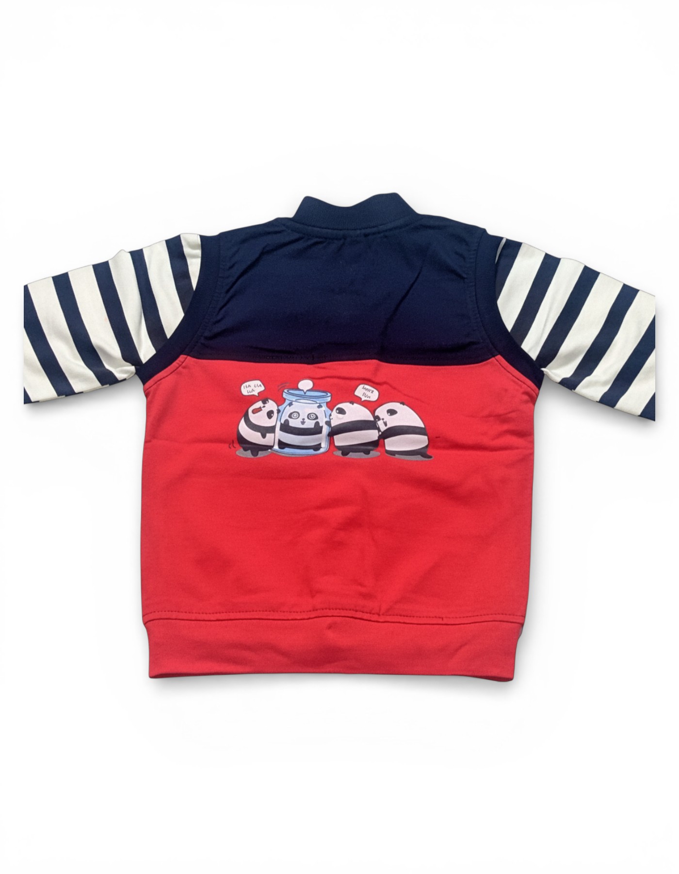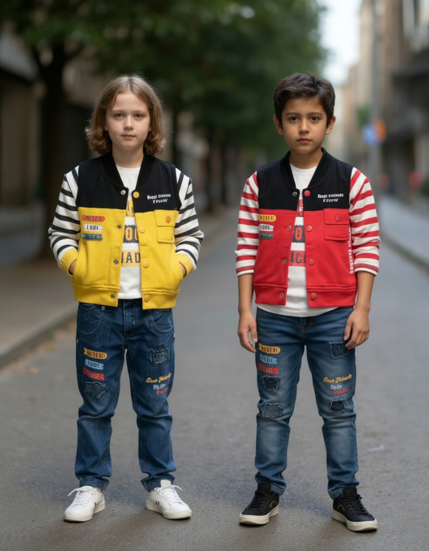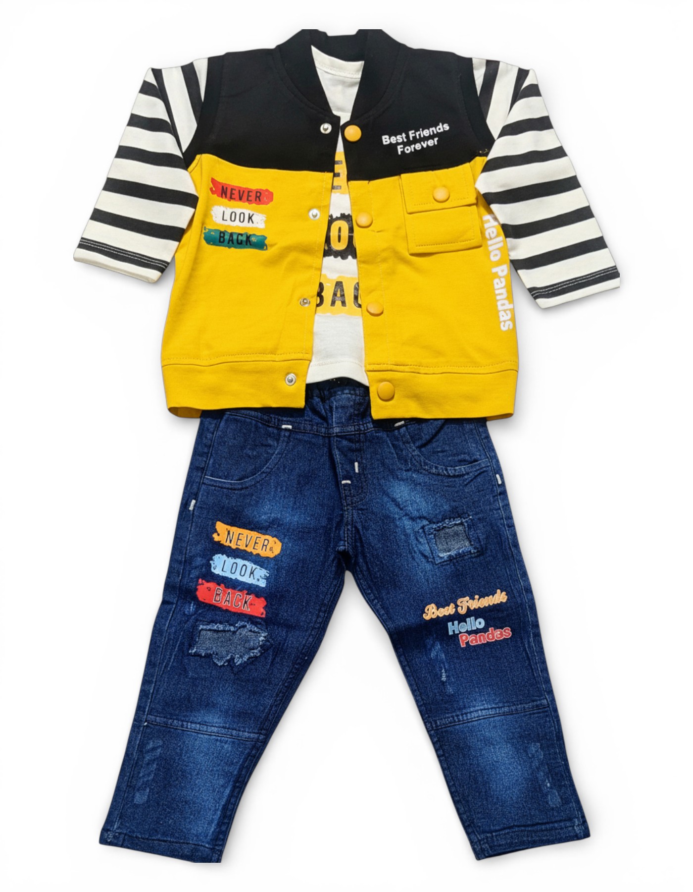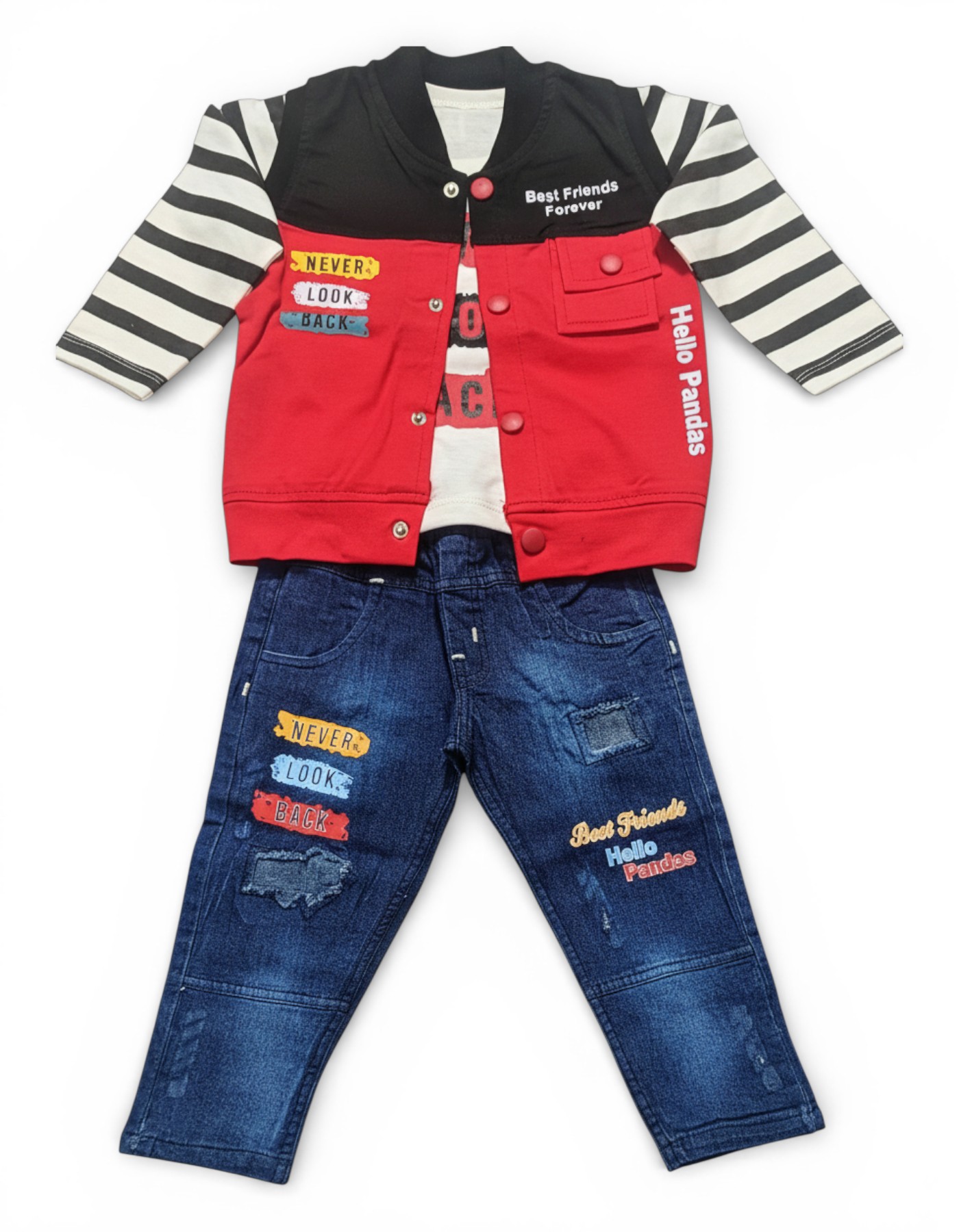 Add a bold, sporty edge to their wardrobe with this high-contrast varsity-inspired ensemble. This three-piece set features a vibrant red and black button-up bomber jacket with striped sleeves, functional pockets, and playful "Best Friends Forever" and "Never Look Back" patches. Layered over a soft graphic tee and paired with premium distressed denim jeans featuring matching motivational patches and "Hello Pandas" embroidery, this outfit is designed for kids who play hard and stay stylish.