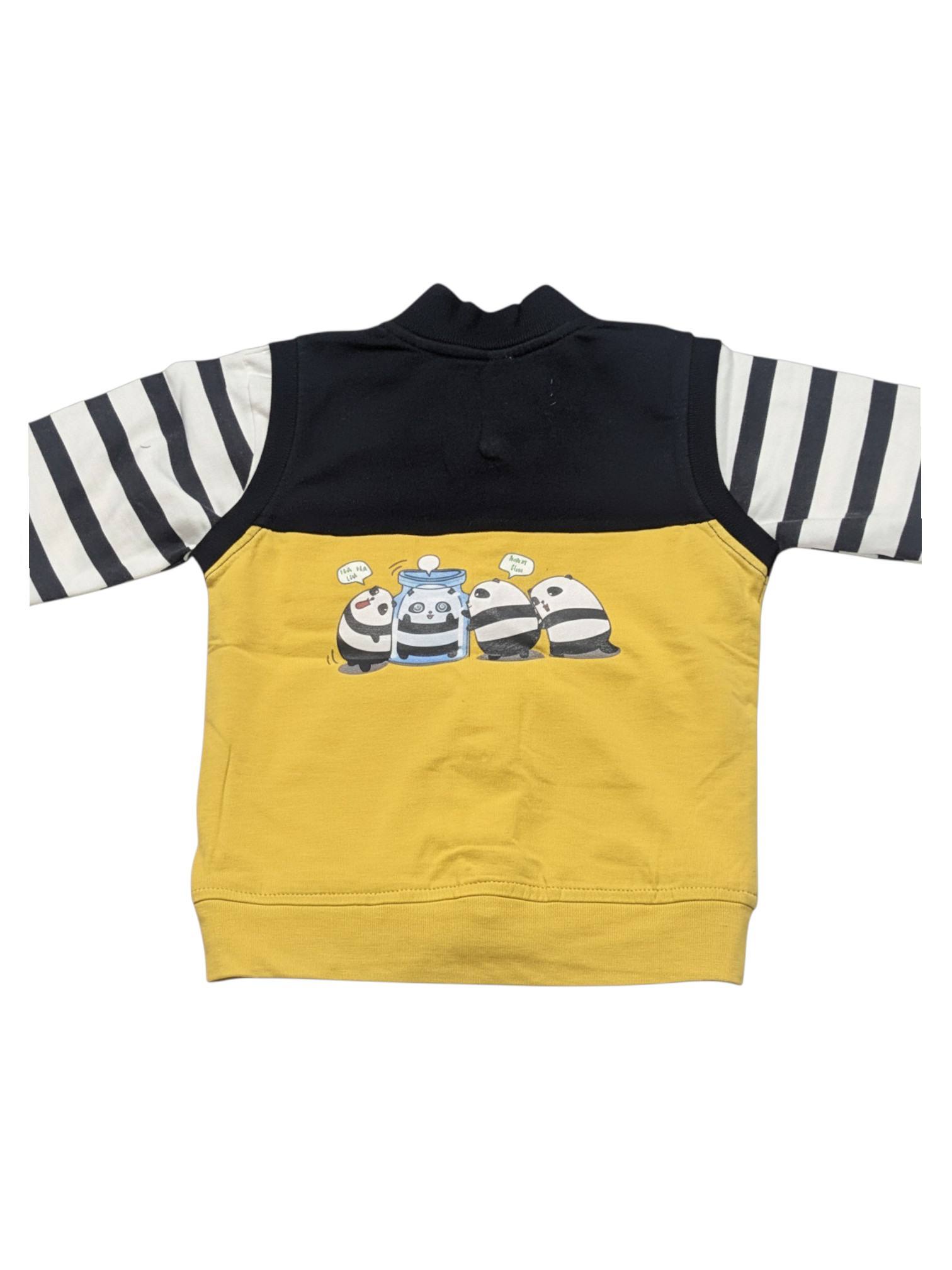 Jacket Details: Contrast striped sleeves, snap-button front, and multi-graphic patchwork.