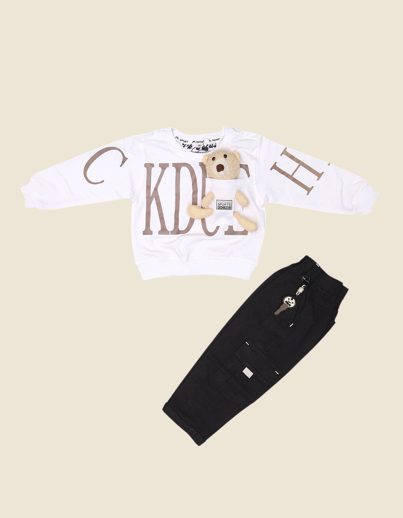 Two-piece childrens set featuring a crew sweatshirt with a stitched plush bear tucked into a faux pocket and matching black cargo-style joggers. Available in blue or white tops with black pants. Playful, comfortable and easy to wear for toddlers and young children.