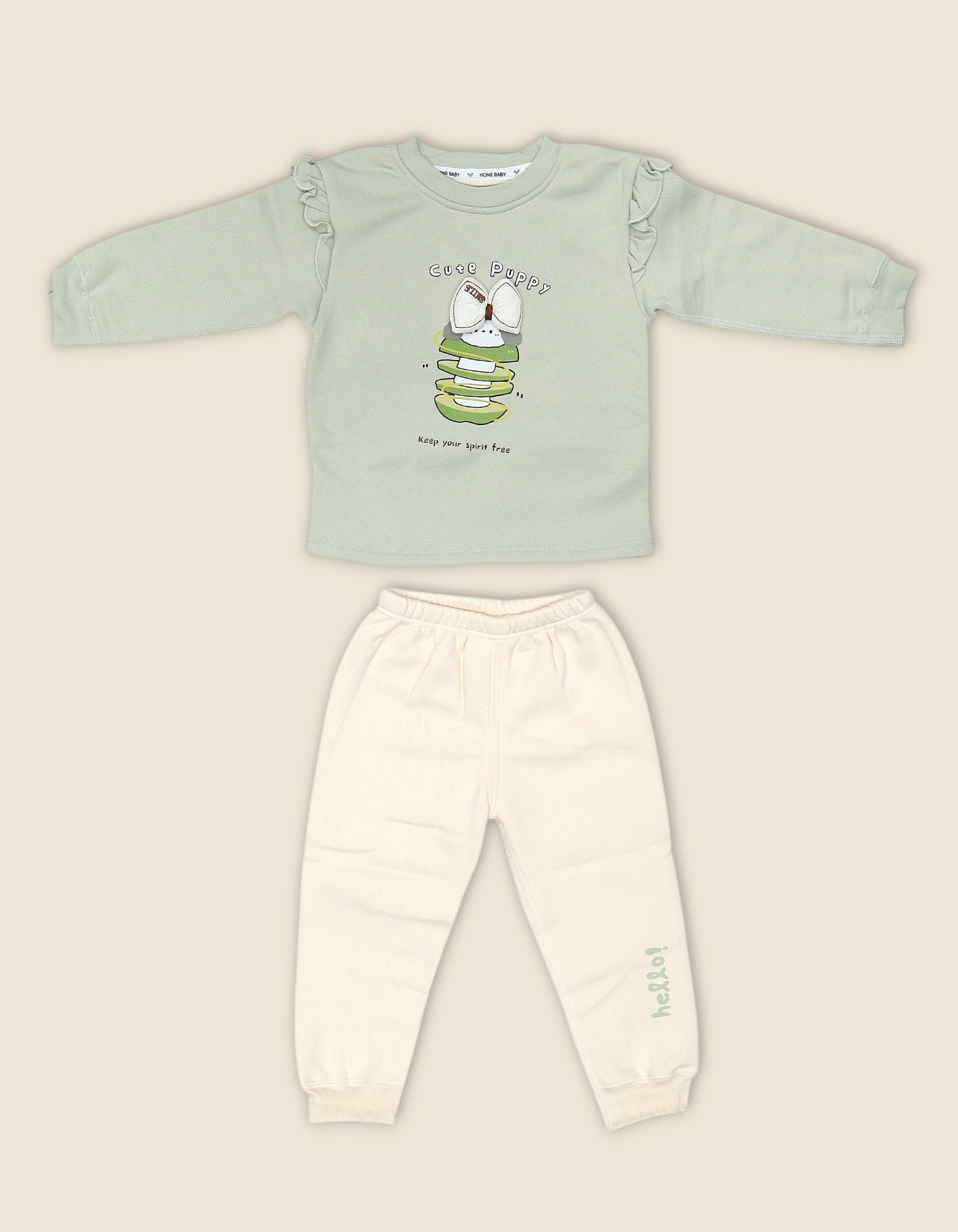 A cozy two piece outfit for toddlers featuring a sage green long sleeve top with ruffle shoulder details and a playful puppy graphic, paired with cream jogger pants with an elastic waist. Soft, comfortable, and perfect for everyday play and lounging.