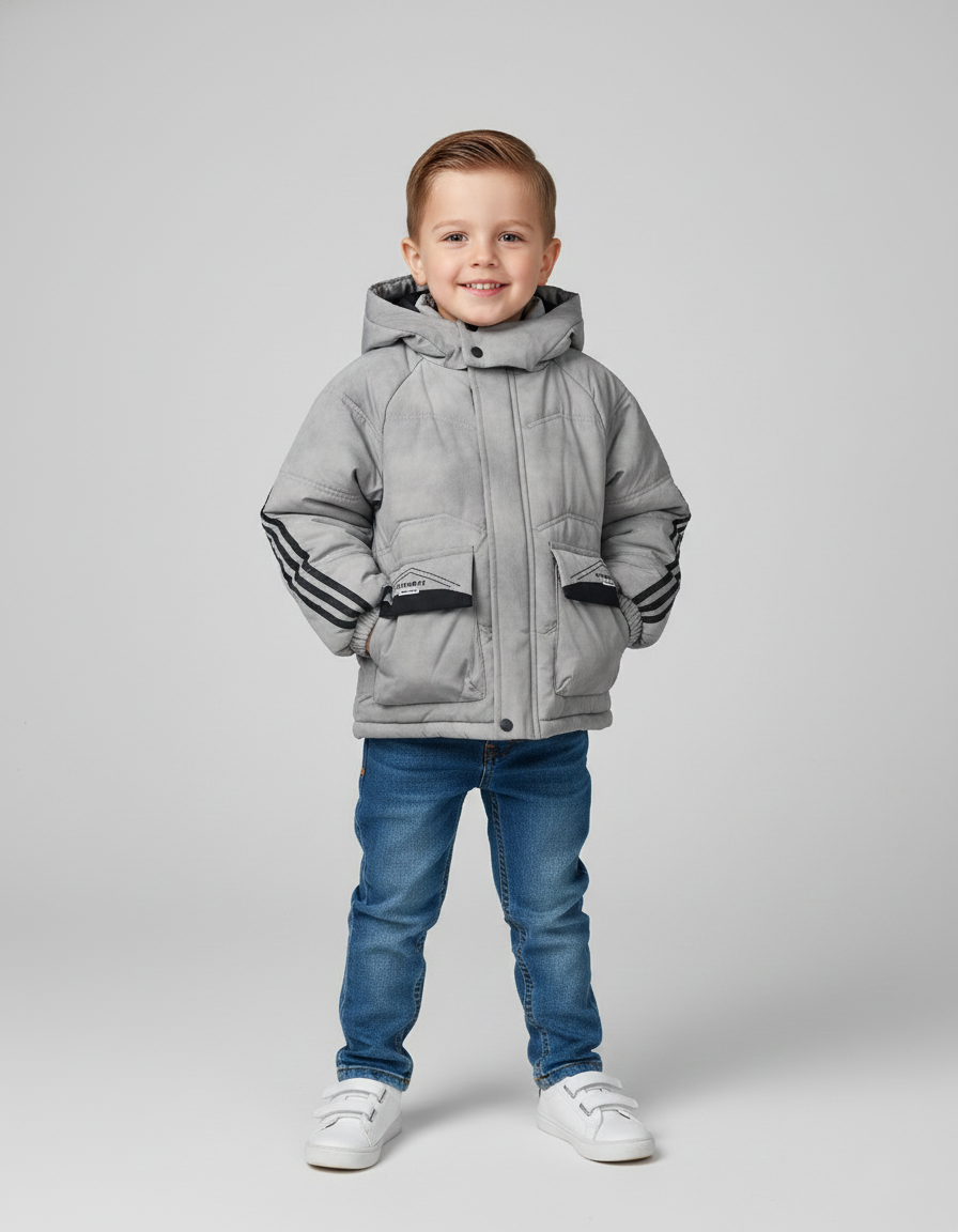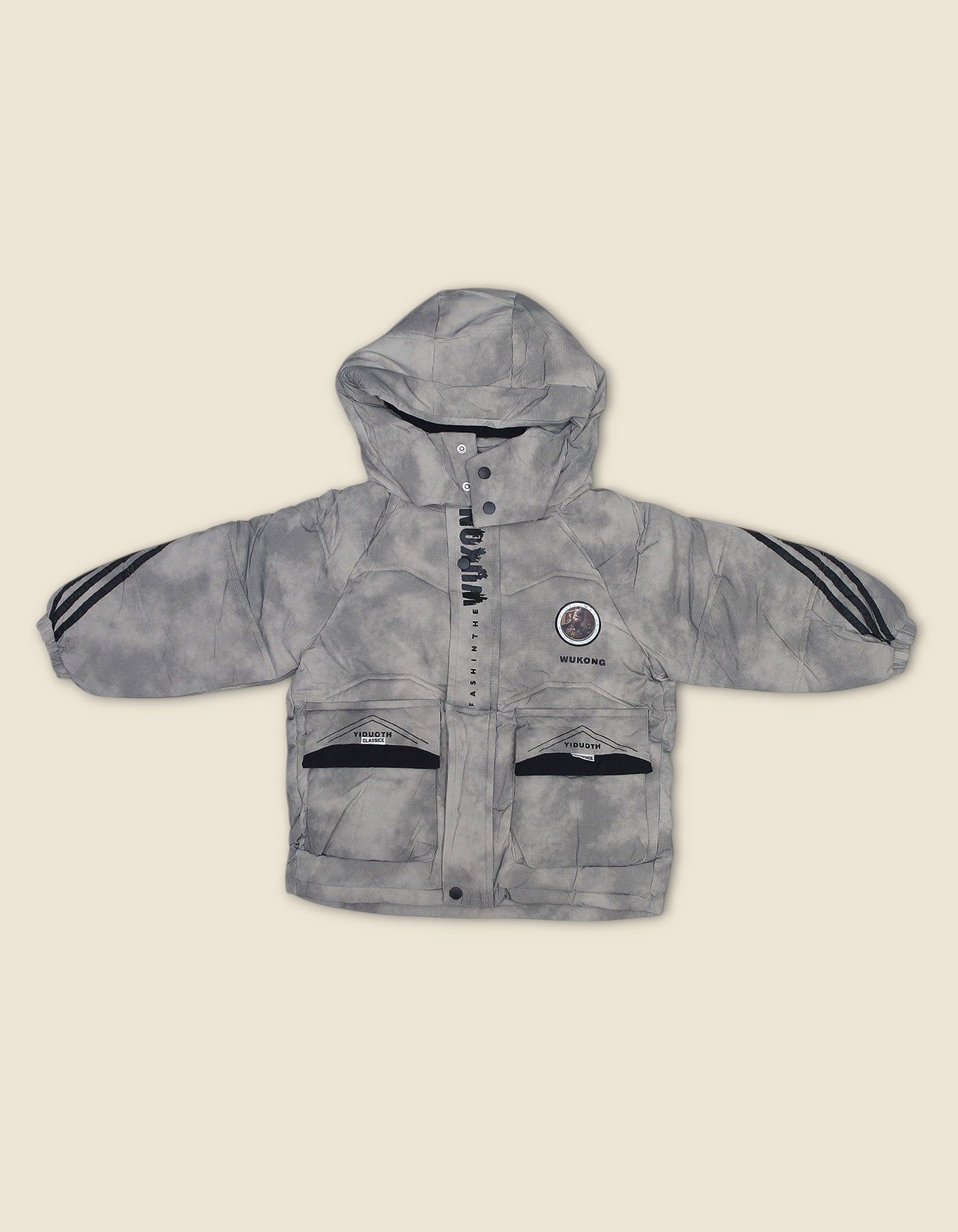 Keep your child warm and stylish with our Kids Winter Puffer Jacket – Grey (Wukong Edition). Designed with a trendy washed-grey texture, bold sleeve stripes, and a front Wukong patch, this jacket combines comfort with a sporty winter look. Perfect for school, outdoor play, and everyday winter wear