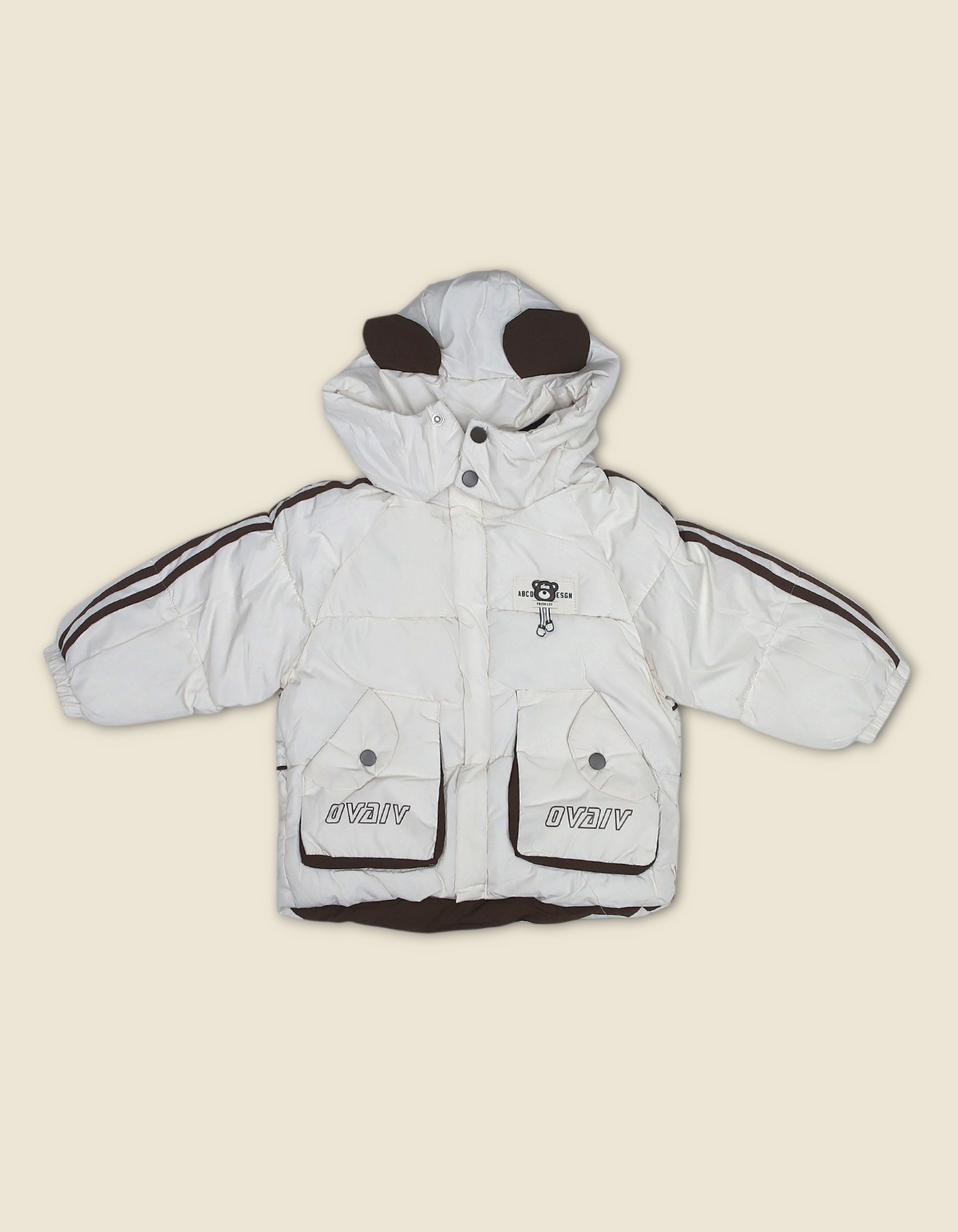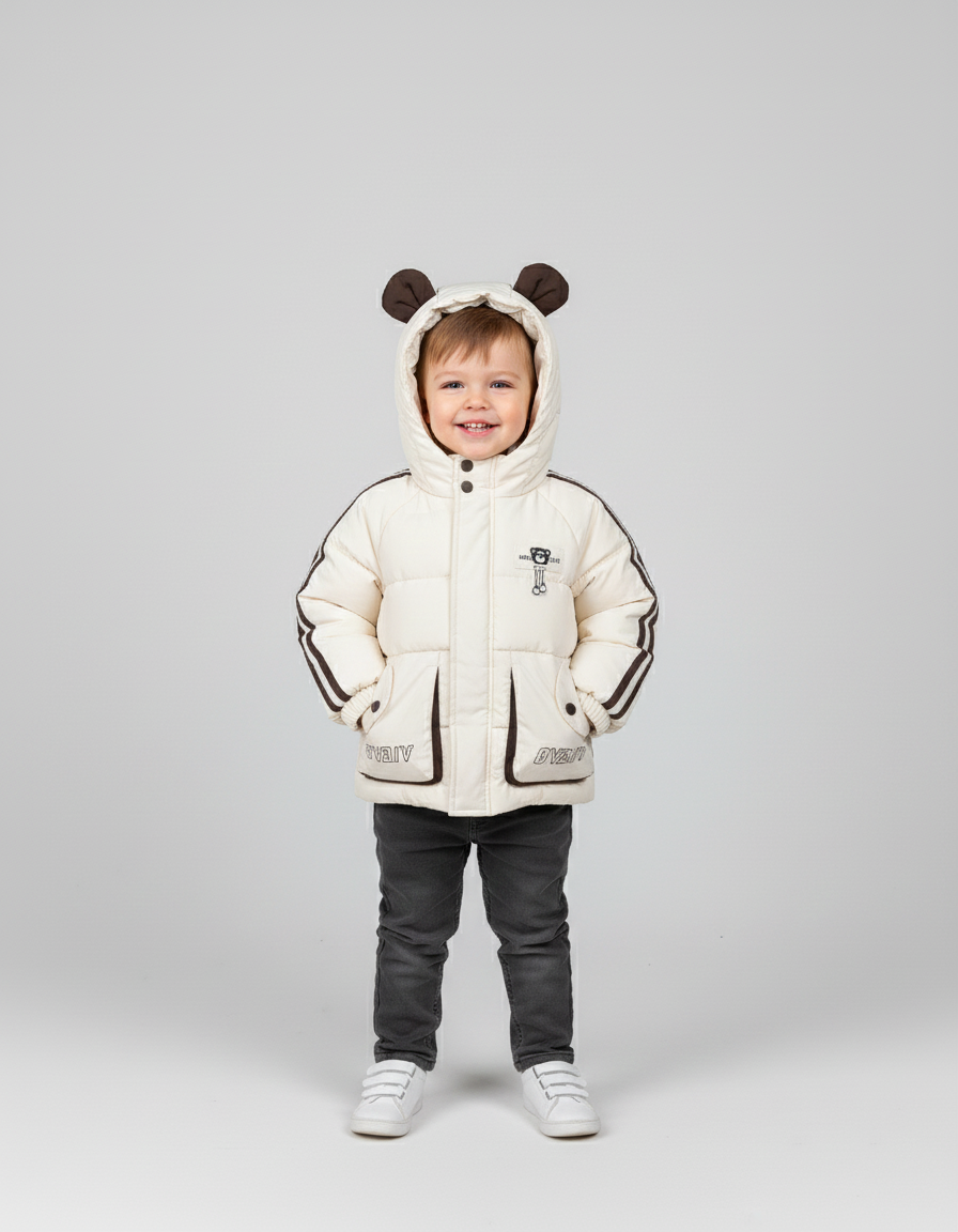 Make winter adorable and warm with our Kids Winter Puffer Jacket with Ear Hood in elegant Off White. Designed with soft padding, contrast brown detailing, and cute bear-ear style on the hood, this jacket keeps your child cozy while adding a playful winter look. Perfect for toddlers and young kids during chilly days