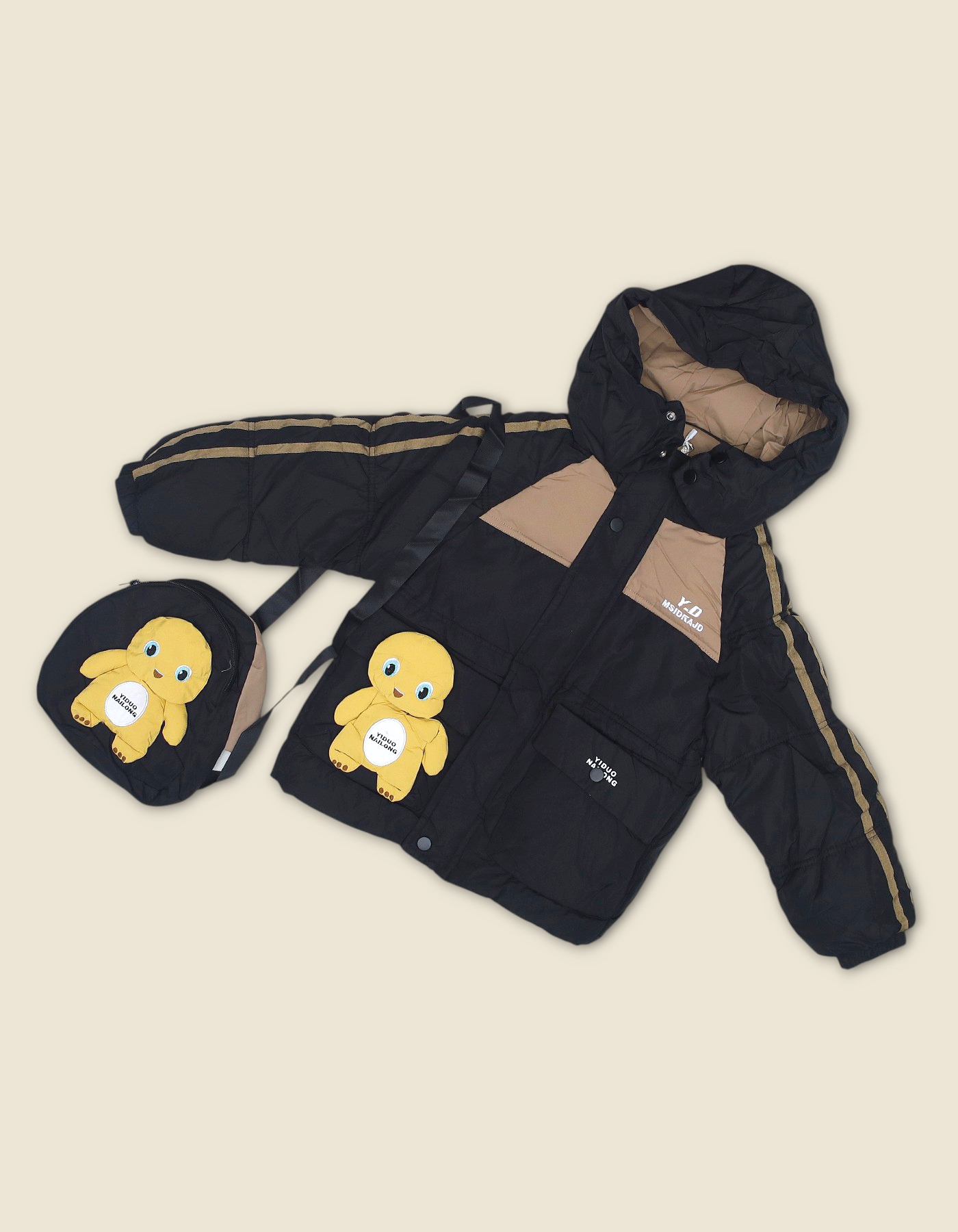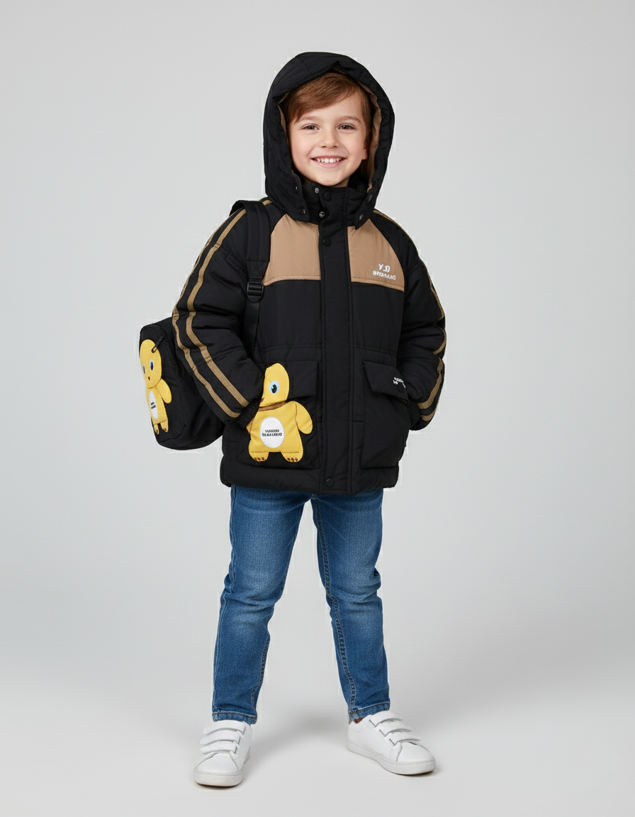 Make winter fun and cozy with our Kids Winter Puffer Jacket with Plush Bag Set in stylish Black. This adorable jacket features a soft puffer design, warm hood, and a cute yellow bear patch, paired with a matching plush bear bag — perfect for school, outings, and winter adventures. A complete winter look kids will love!