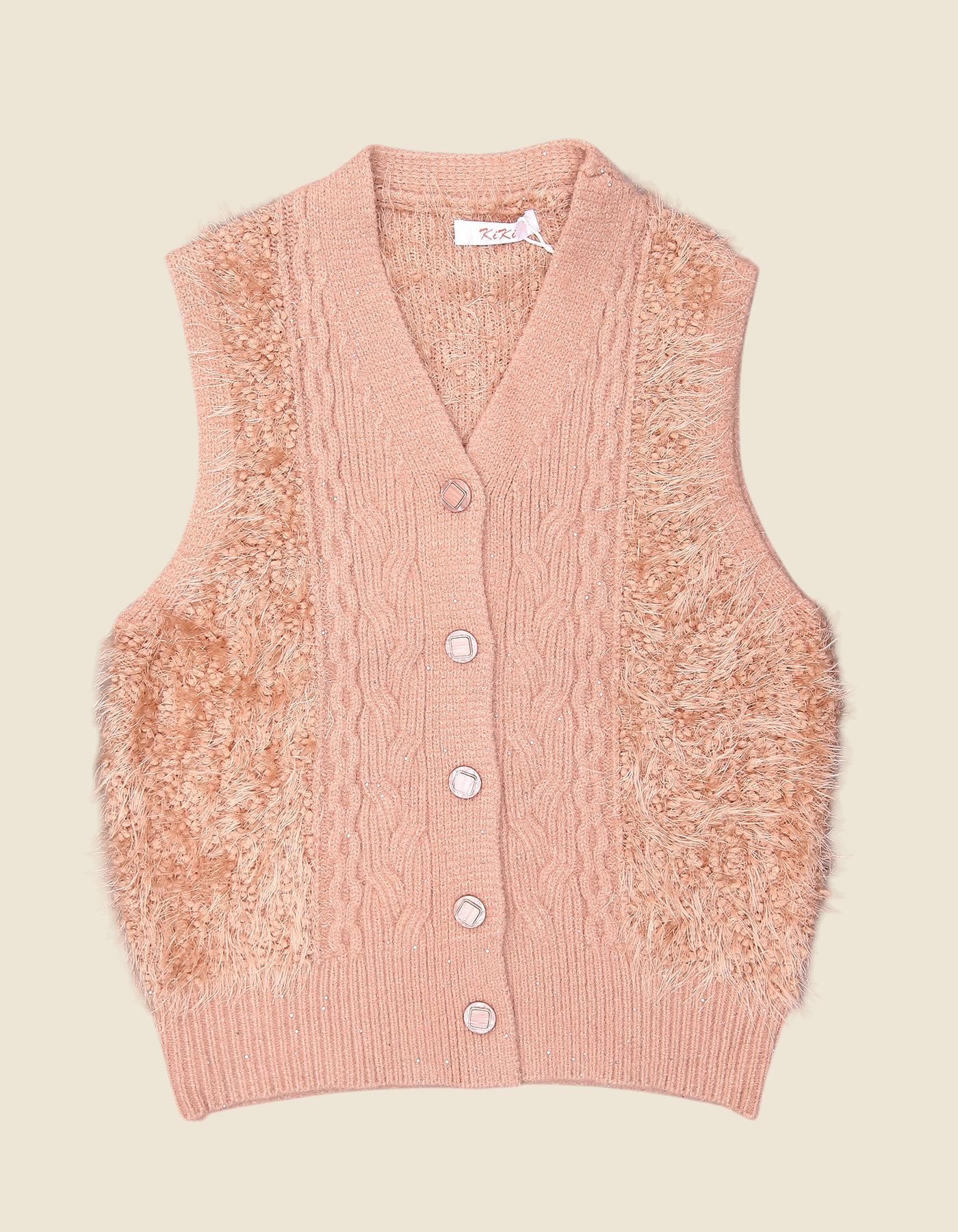 Stay cozy and stylish with this trendy sleeveless sweater vest, designed with a chic cable-knit front and textured fur-style side panels. The button-down closure and ribbed hem add a touch of classic elegance, making it perfect for layering over shirts, turtlenecks, or dresses. Soft, warm, and fashionable, this vest is a versatile winter essential.