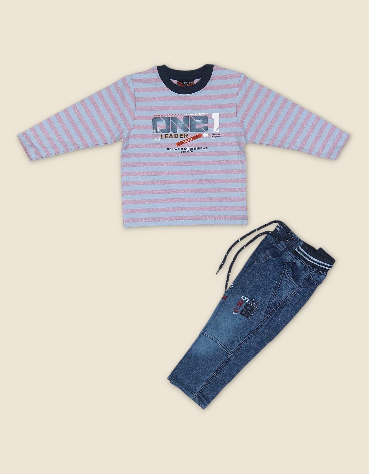 Trendy baby outfit with striped shirt and denim pants. Features bold leader text and graphic details for a stylish look.