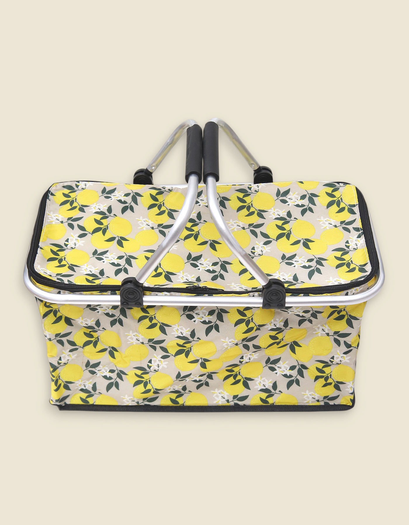Add a splash of freshness to your outings with this stylish lemon-print picnic basket. Designed with a sturdy aluminum frame and insulated lining, it keeps your food and drinks fresh while being lightweight and easy to carry. Perfect for picnics, grocery shopping, camping, or beach trips, this basket combines practicality with cheerful charm.
