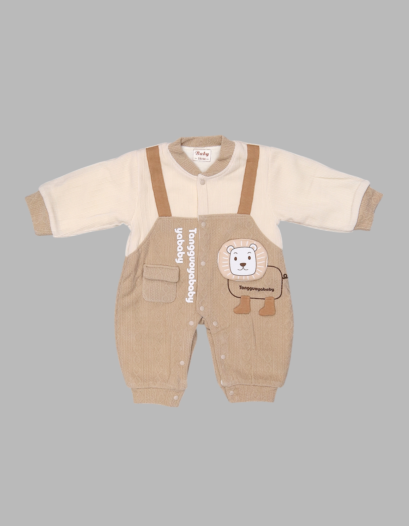 The Newborn Lion Overalls Style Romper is a stylish and cozy one-piece outfit designed to keep your little one warm and adorable. Made with soft quilted fabric, it combines comfort and functionality while giving the appearance of layered overalls. The romper features a cute lion face embroidery with boots, along with printed text for a playful look. The front snap button closure makes dressing and diaper changes quick and hassle-free, while the full-coverage design ensures your baby stays snug and cozy during colder days.