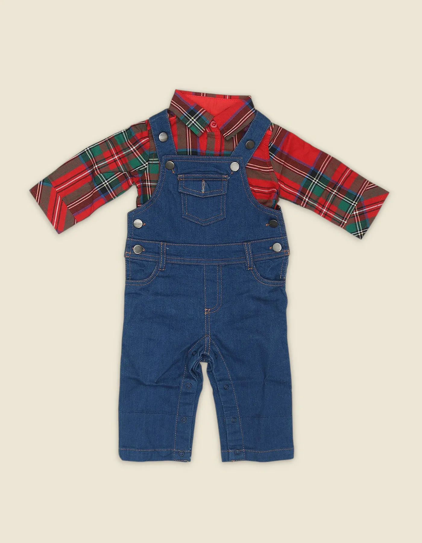 2-Piece Set – Includes a printed cotton shirt and a denim-style romper.