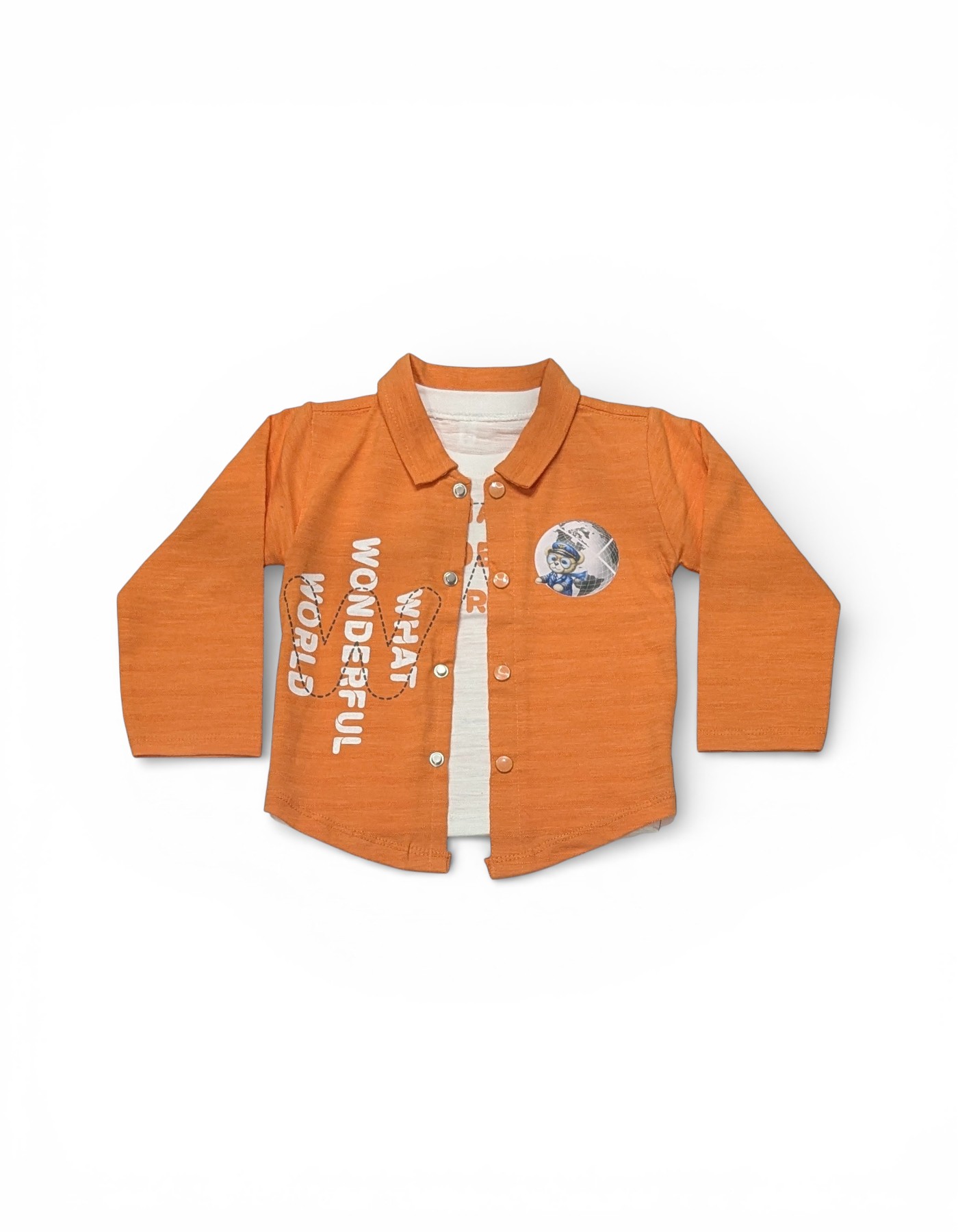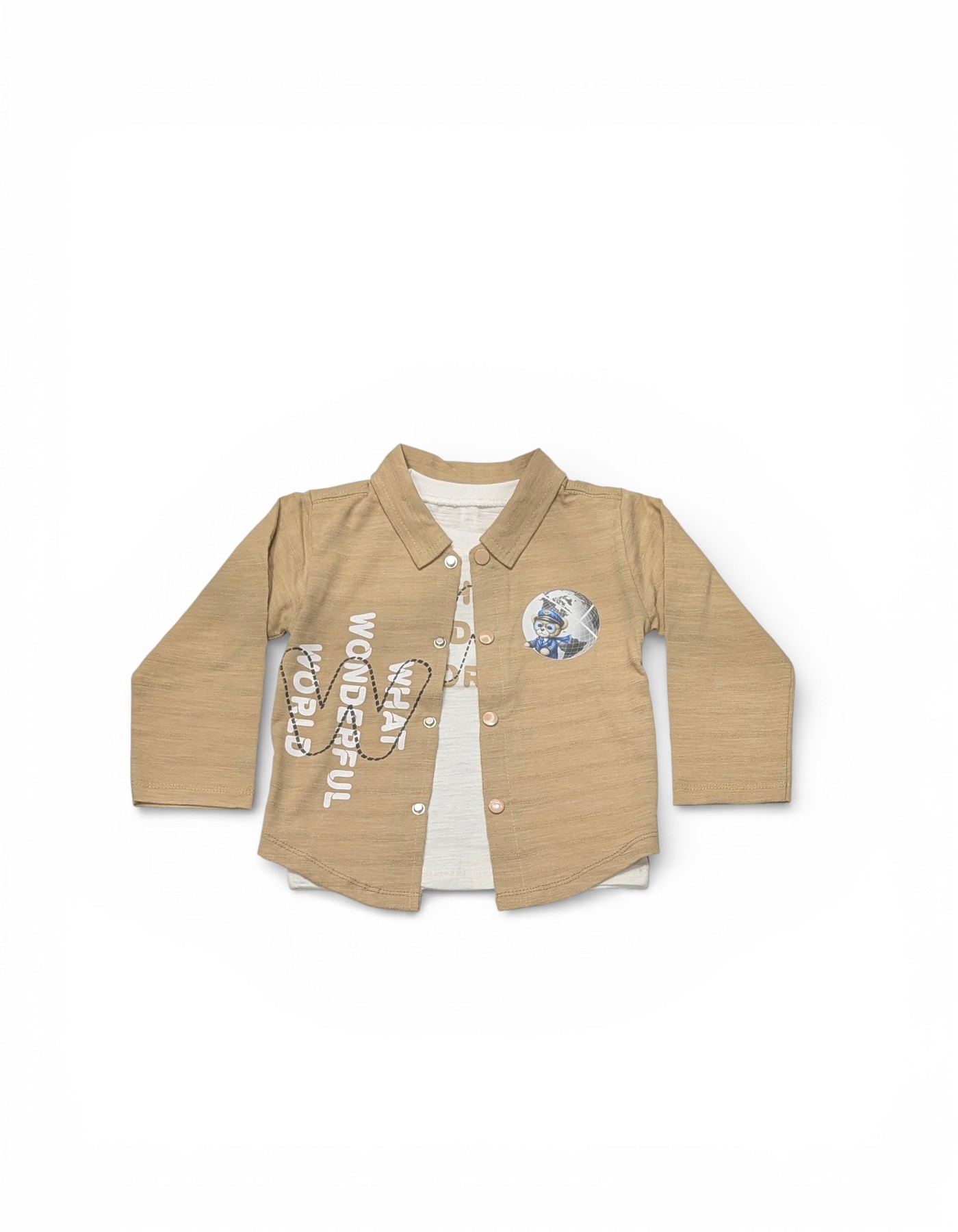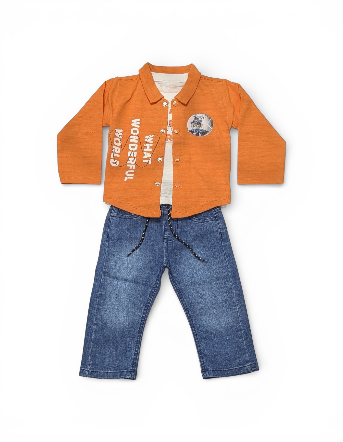 Adventure awaits in this dapper three-piece ensemble! Designed for the stylish little guy on the go, this set features a versatile khaki shirt-jacket (shacket) adorned with a charming pilot patch and "What a Wonderful World" graphic. Paired with a soft, breathable cotton t-shirt and classic medium-wash drawstring jeans, it’s the perfect blend of "mini-gentleman" style and playground-ready comfort.