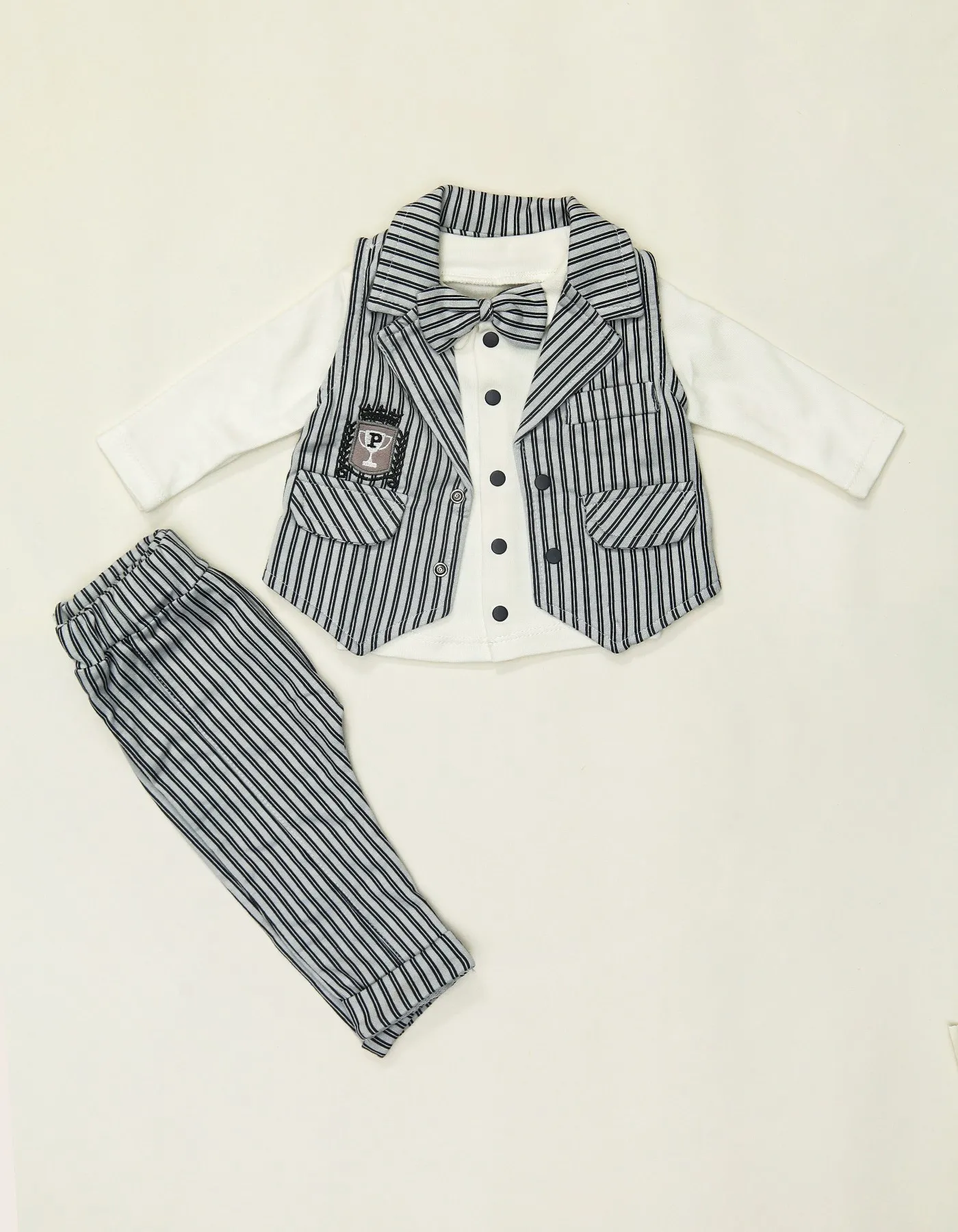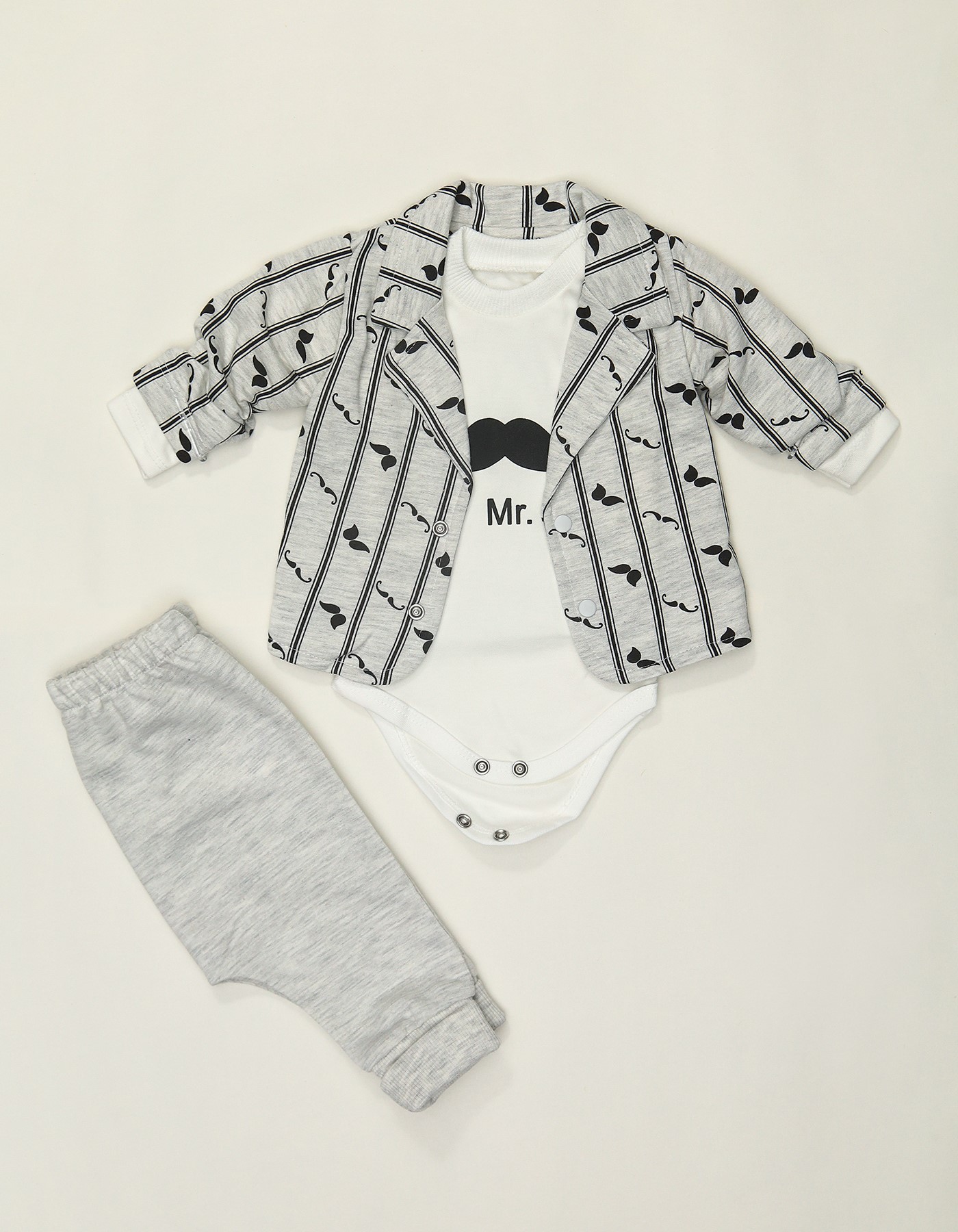 Give your little one a dapper and stylish look with this 3-piece baby boy outfit. Featuring a light grey printed jacket, a white bodysuit with a cute mustache design, and matching jogger pants, this outfit is perfect for both casual and special occasions. The soft, breathable fabric ensures all-day comfort, while snap buttons make dressing and diaper changes super easy.