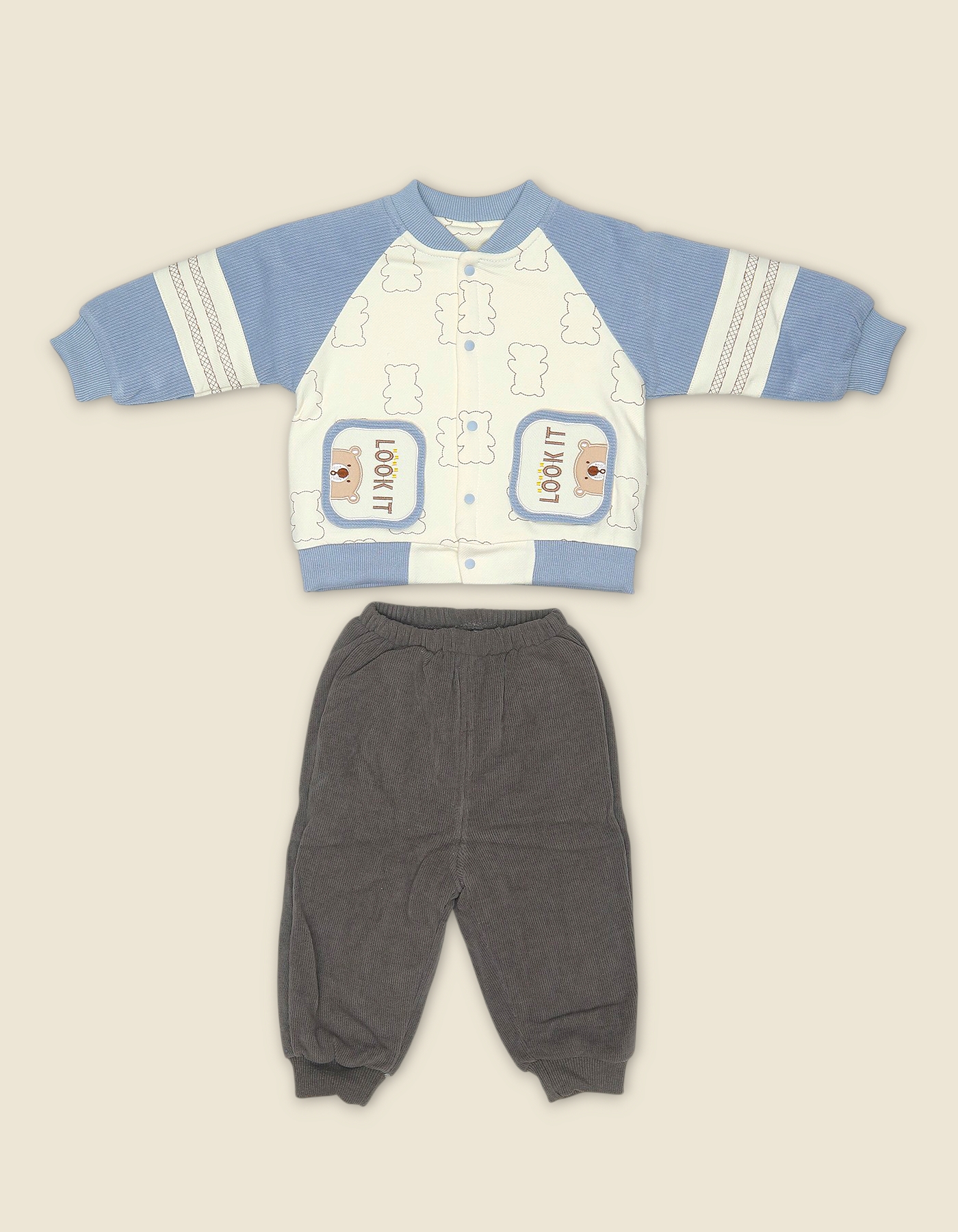 Printed quilted baby outfit with bear face pockets and matching pants. Designed for warmth, comfort and playful winter style.