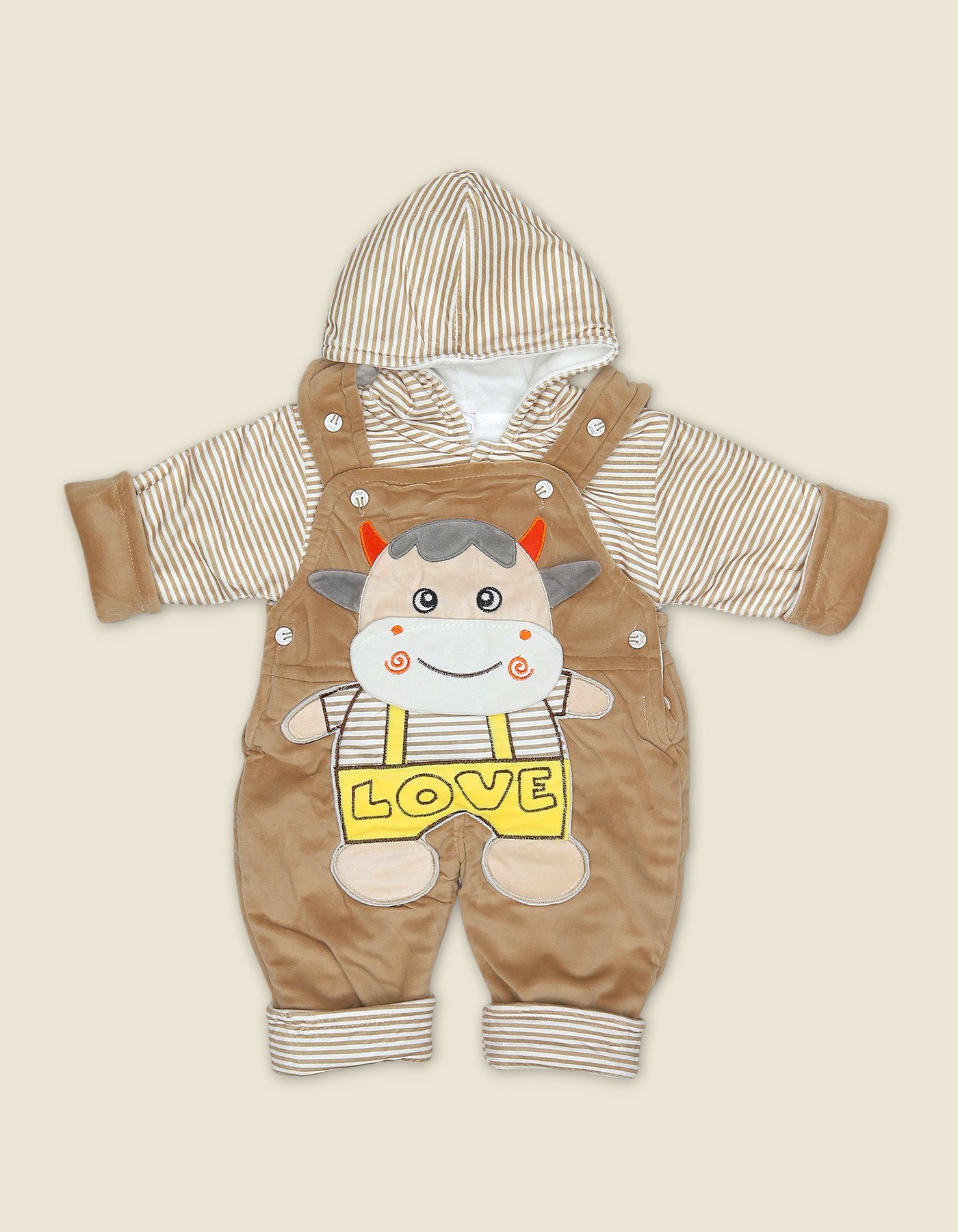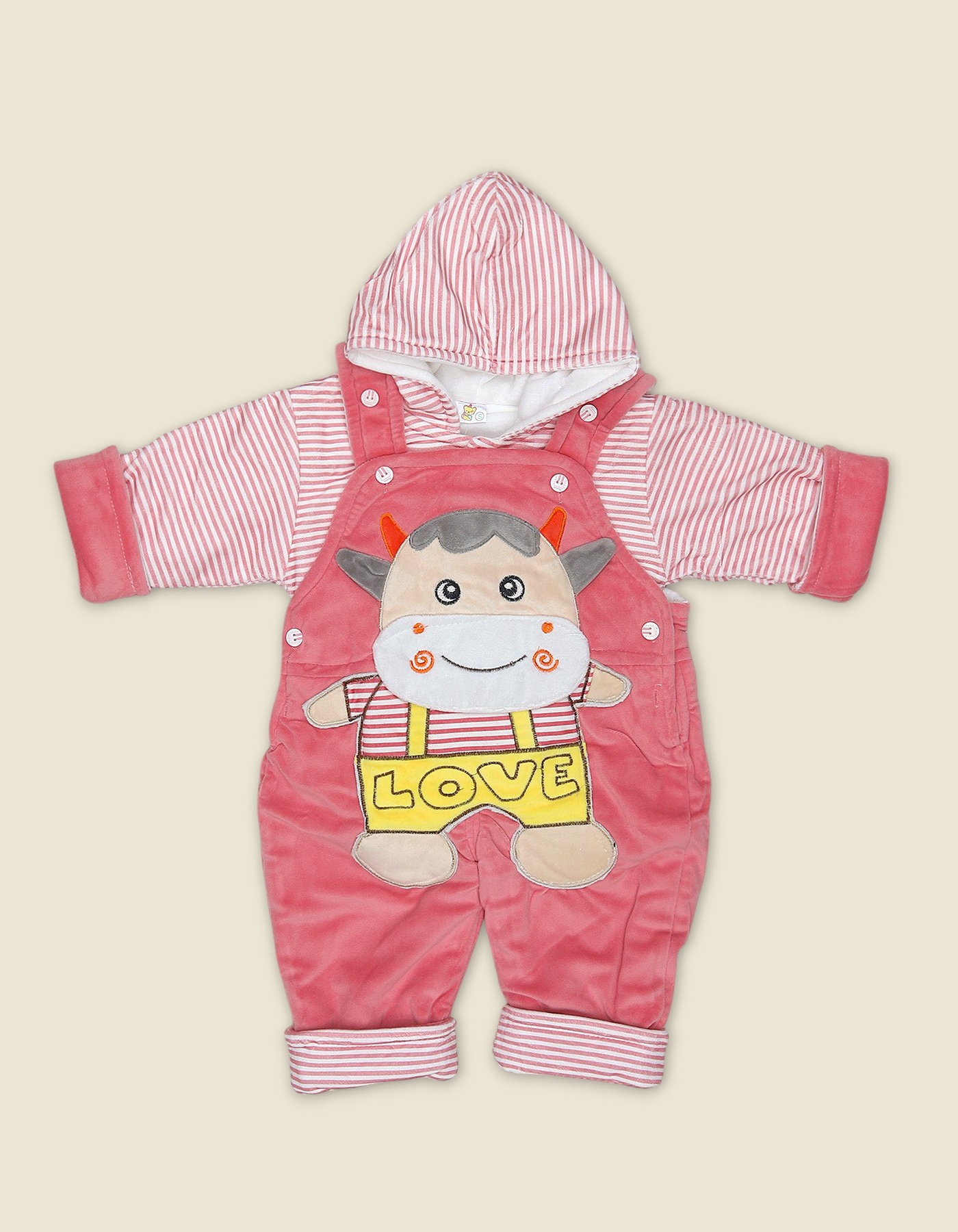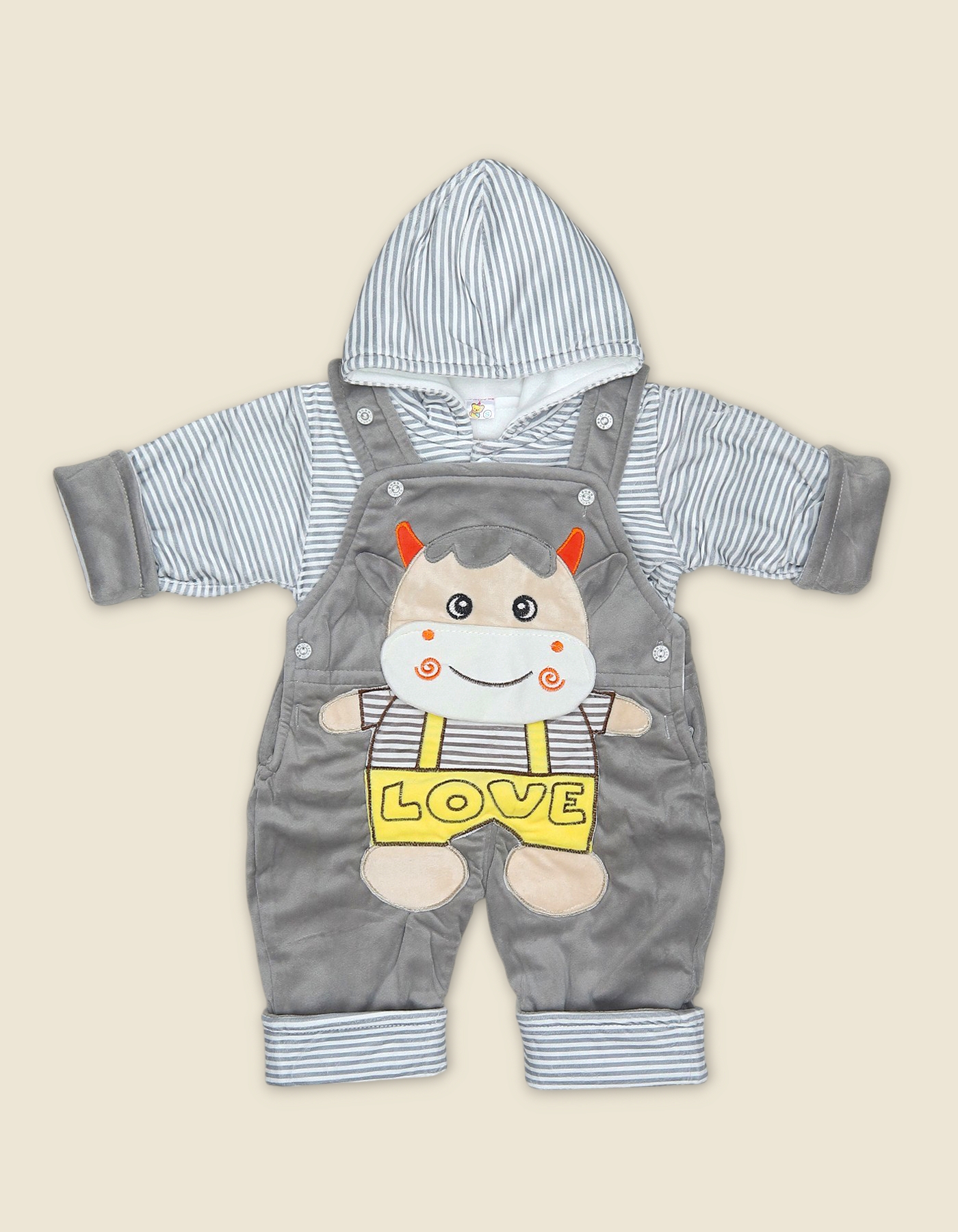 Playful baby romper set with cartoon cow embroidery and striped hooded shirt. Designed for comfort, warmth and cheerful style.