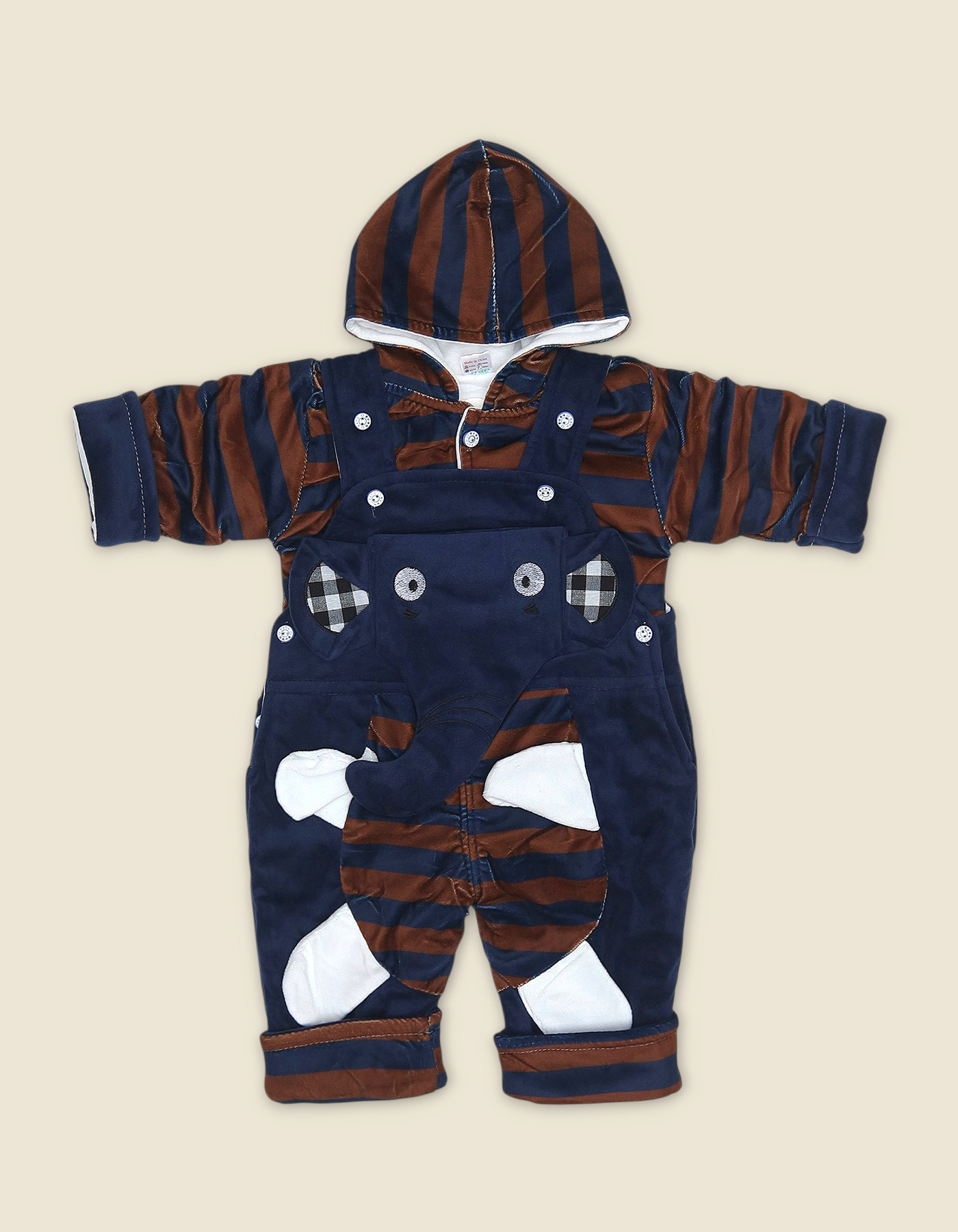 Whimsical baby romper set with stitched animal face and “LOVE” patch. Includes striped hooded shirt and matching overalls for cozy comfort.