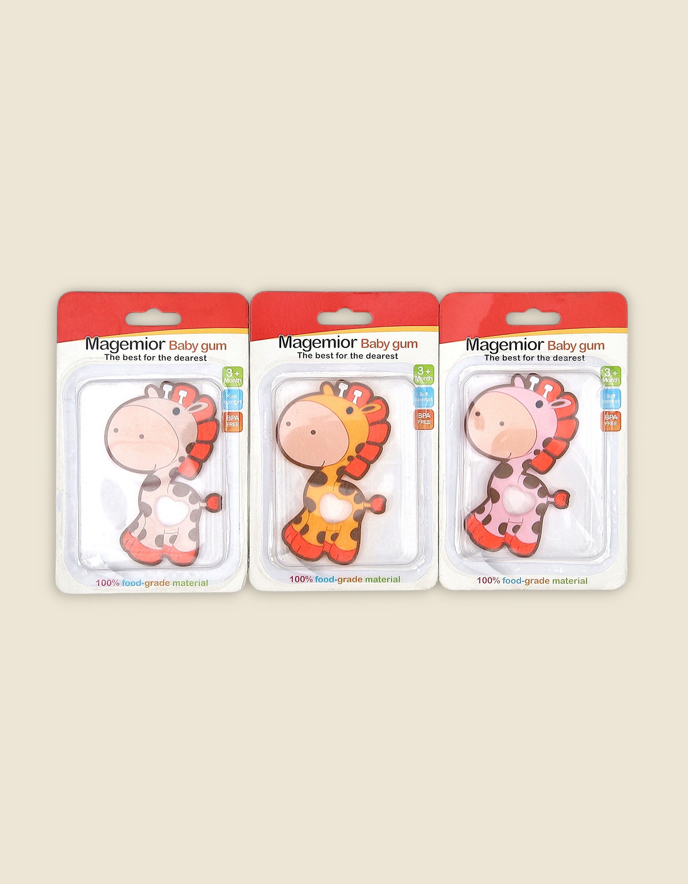 Cute giraffe shaped silicone teether made from food grade material and safe for babies from 3 months. Soft and flexible with gentle textures to massage gums and ease teething discomfort. Easy for little hands to hold and simple to clean. Individually retail packed. Assorted colors shown.