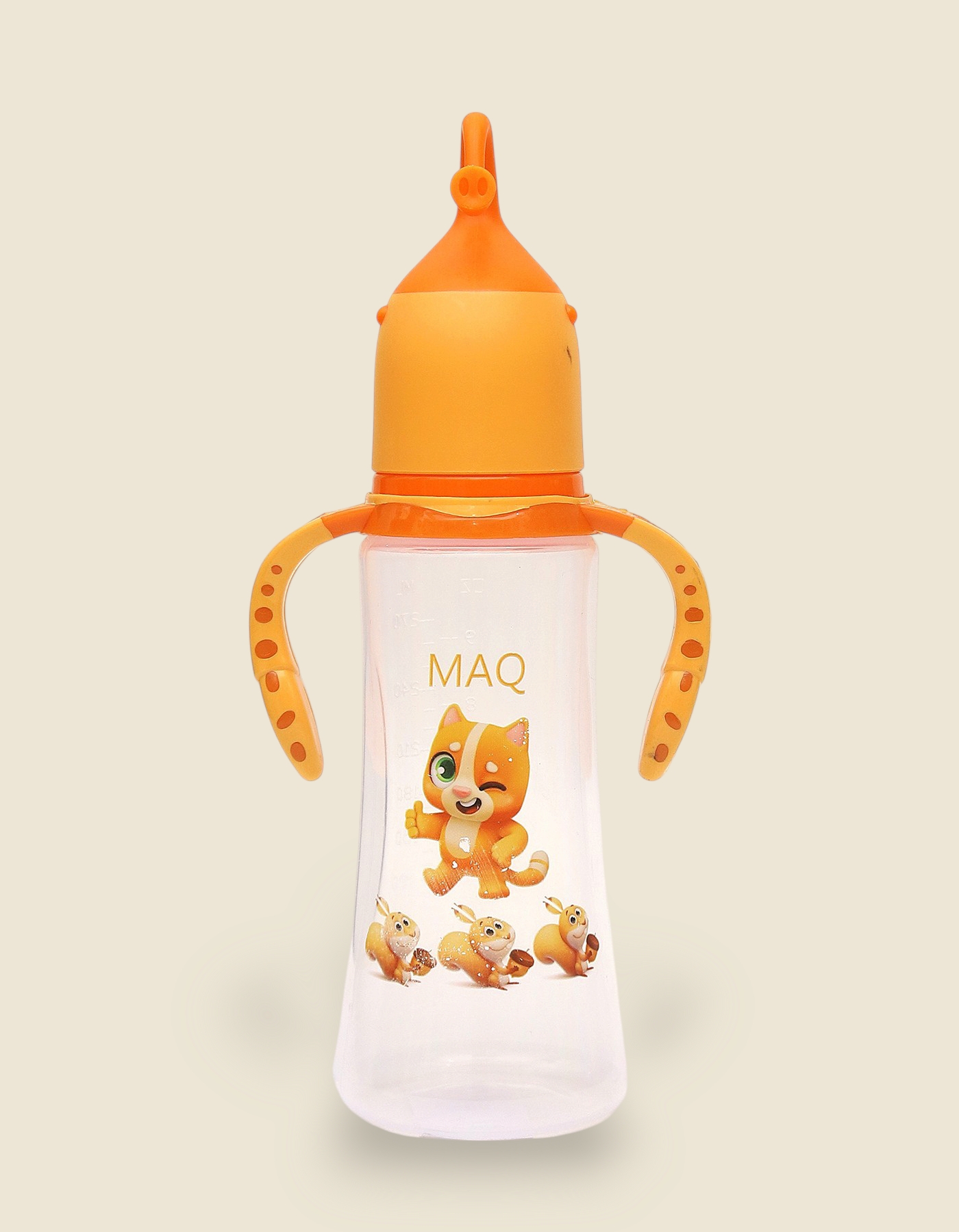 The MAQ cartoon training feeder bottles are designed to make self-feeding fun and easy for toddlers. With bright cartoon prints and dual side handles, these bottles help little hands grip comfortably while drinking. The durable, BPA-free material ensures safety, while the spill-proof spout prevents messes. Available in 5 vibrant colors and character prints, these bottles are the perfect mix of safety, function, and fun.