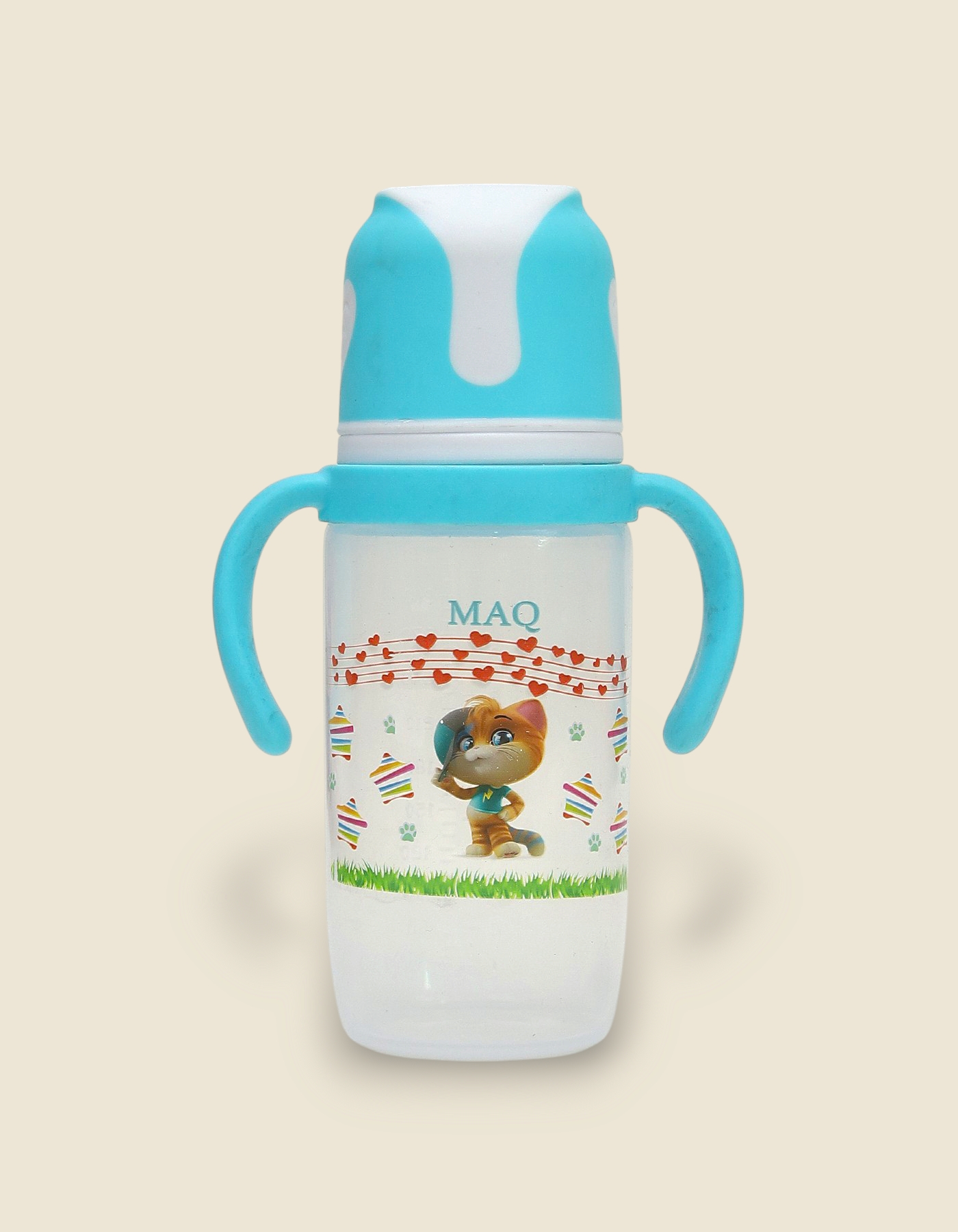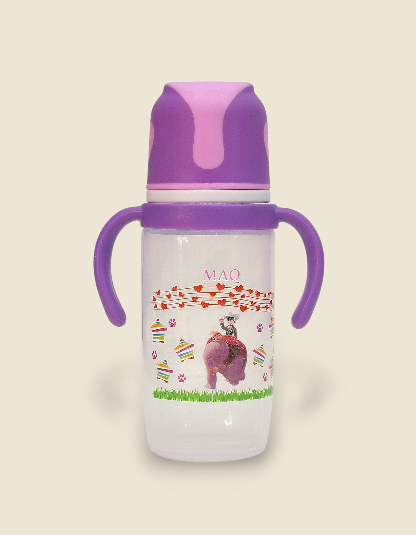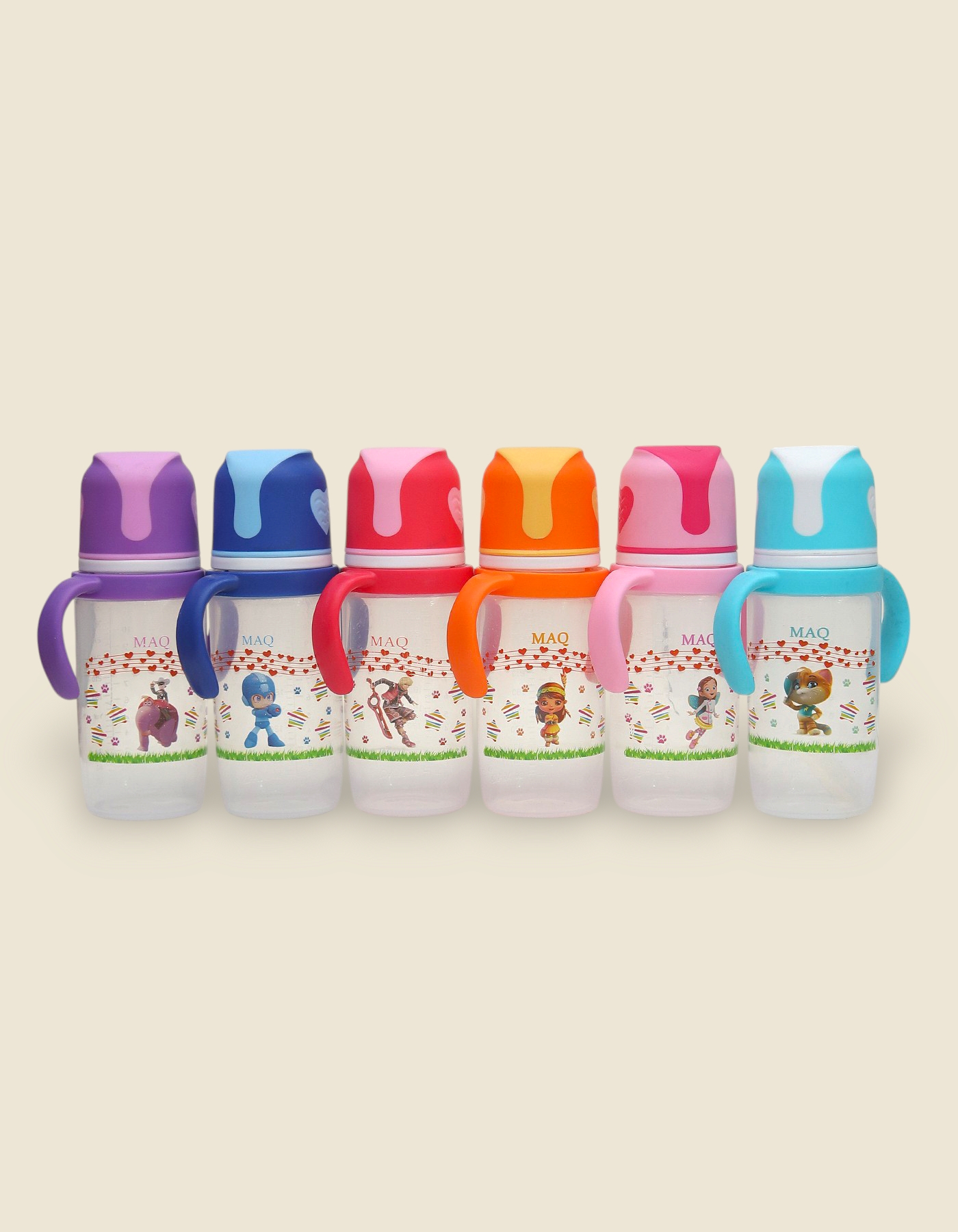The MAQ baby feeder is designed to help infants transition from nursing to independent drinking. These bottles feature a dual-handle design, allowing small hands to grip and control the bottle easily. Each bottle is decorated with vibrant, colorful cartoon characters and patterns to make feeding time engaging for your baby.