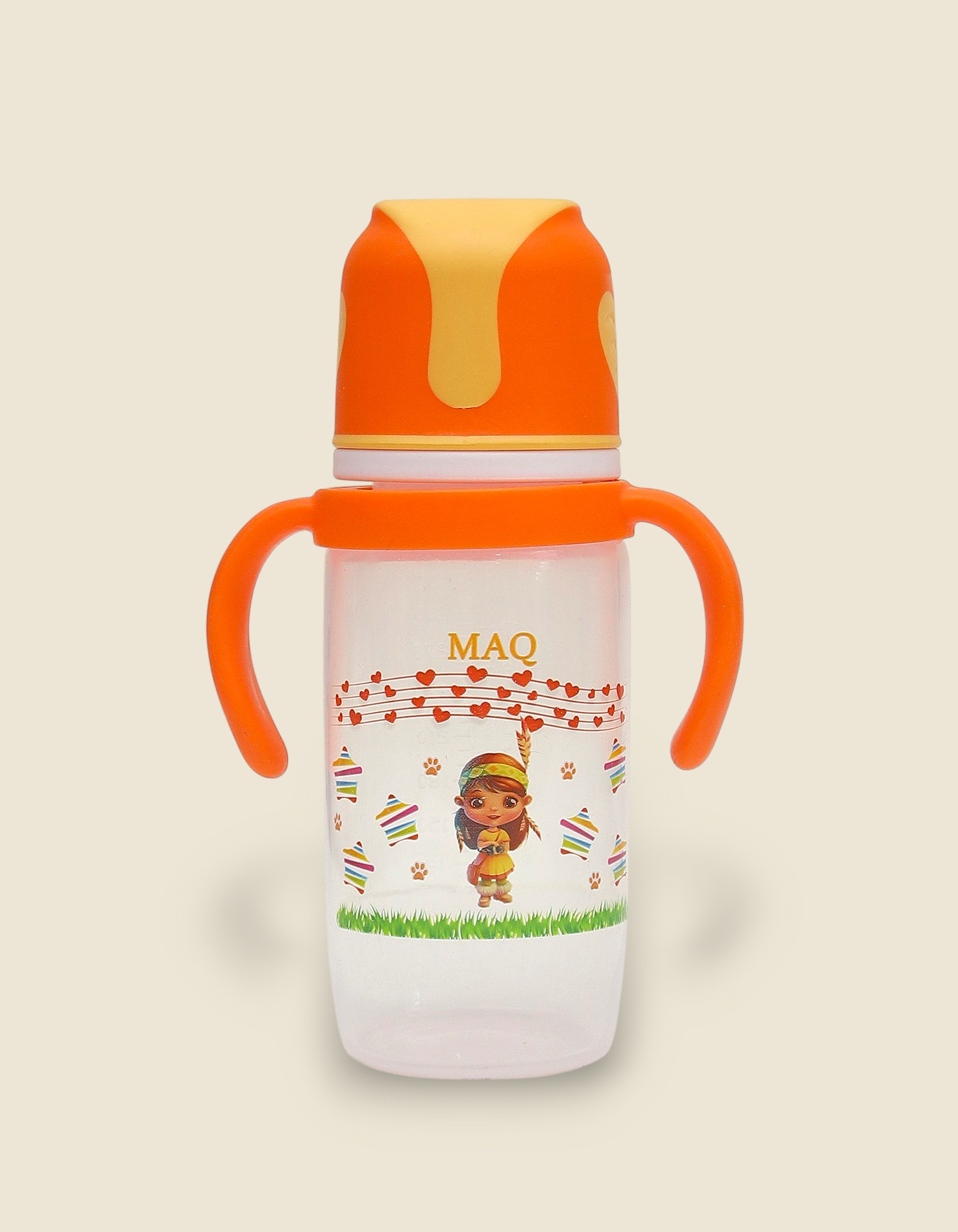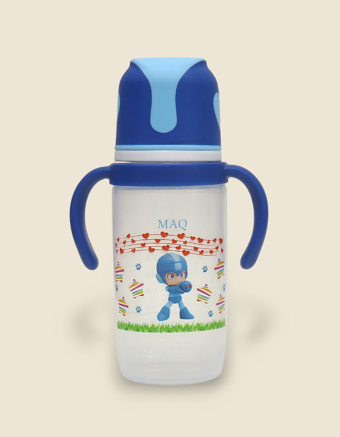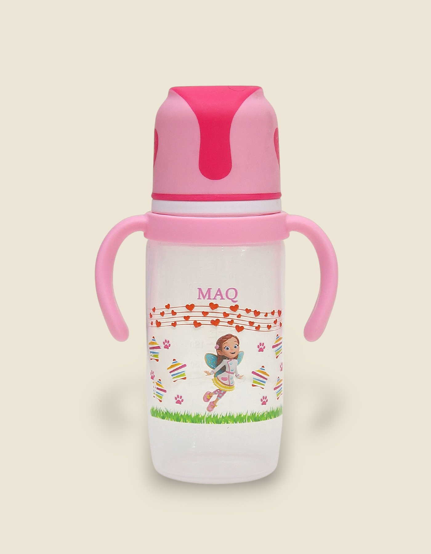 The MAQ baby feeder is designed to help infants transition from nursing to independent drinking. These bottles feature a dual-handle design, allowing small hands to grip and control the bottle easily. Each bottle is decorated with vibrant, colorful cartoon characters and patterns to make feeding time engaging for your baby.