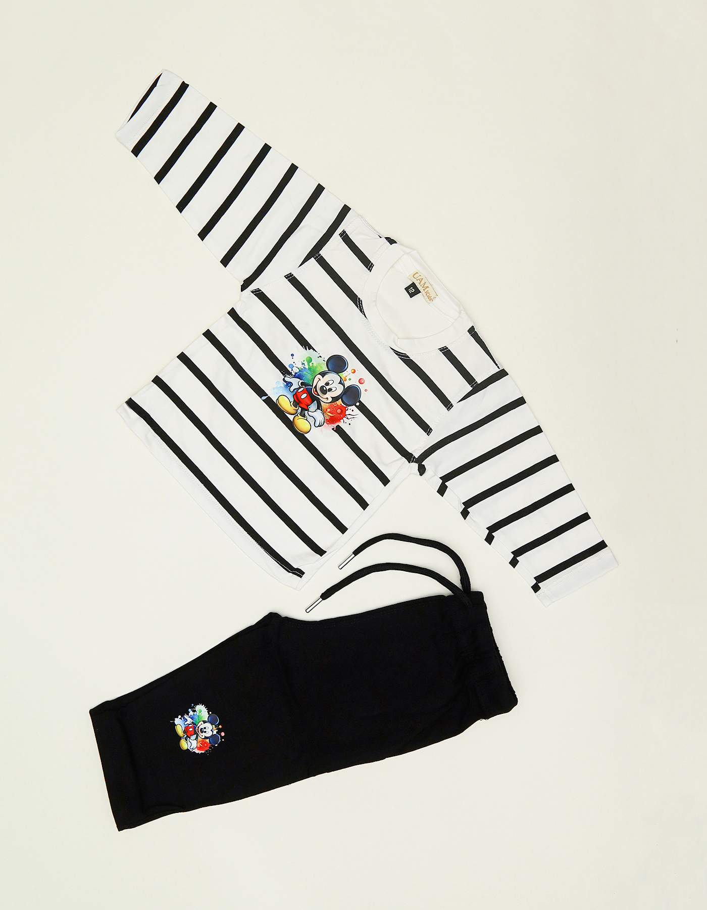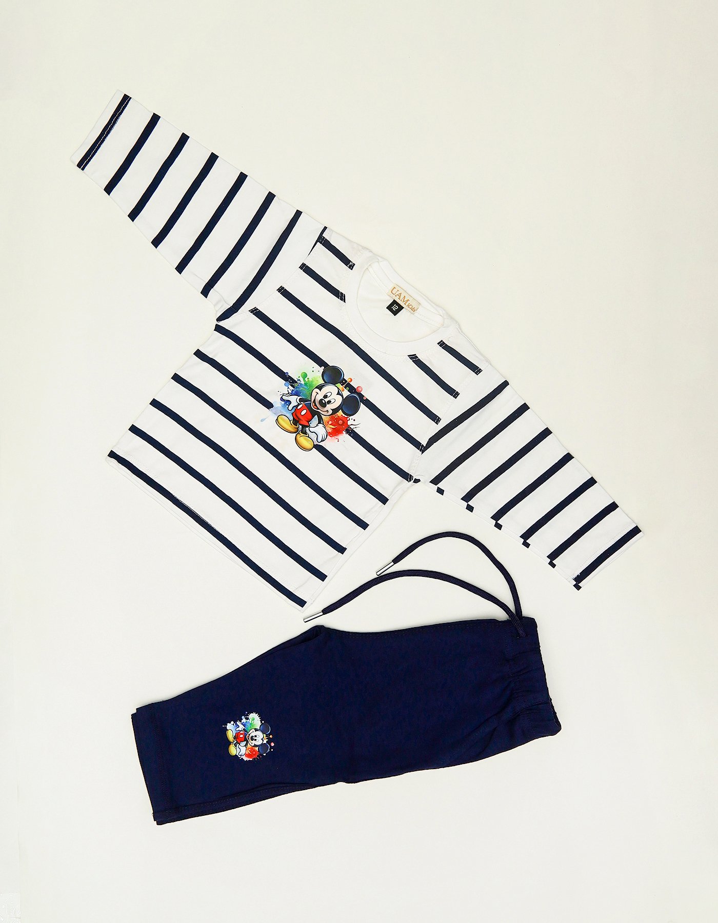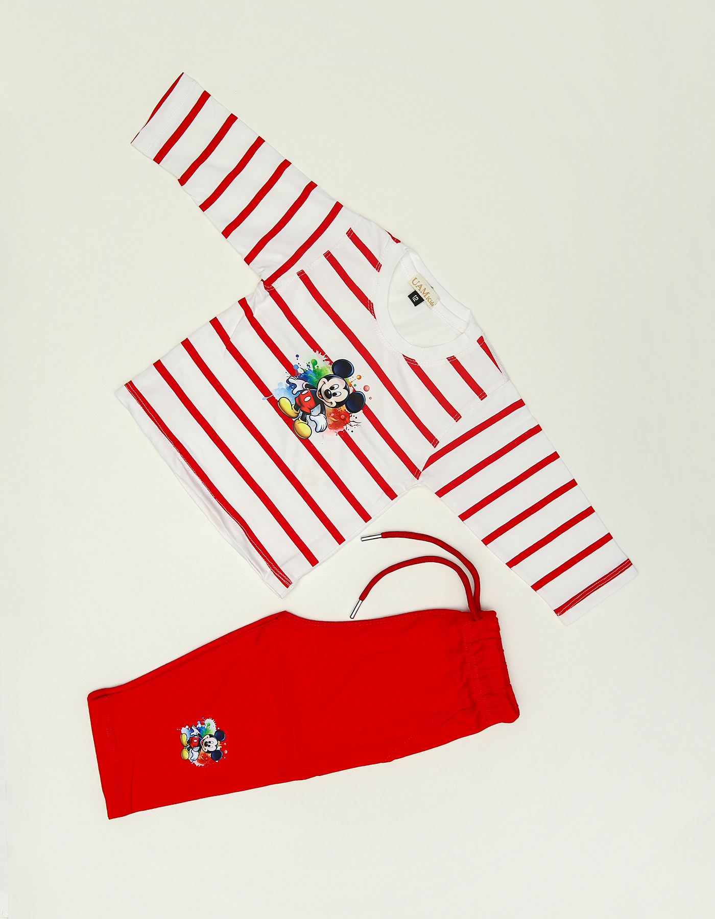 A fun and stylish outfit for little boys featuring a striped full-sleeve shirt with Mickey Mouse print and matching pajama bottoms. Designed for both comfort and playtime style.