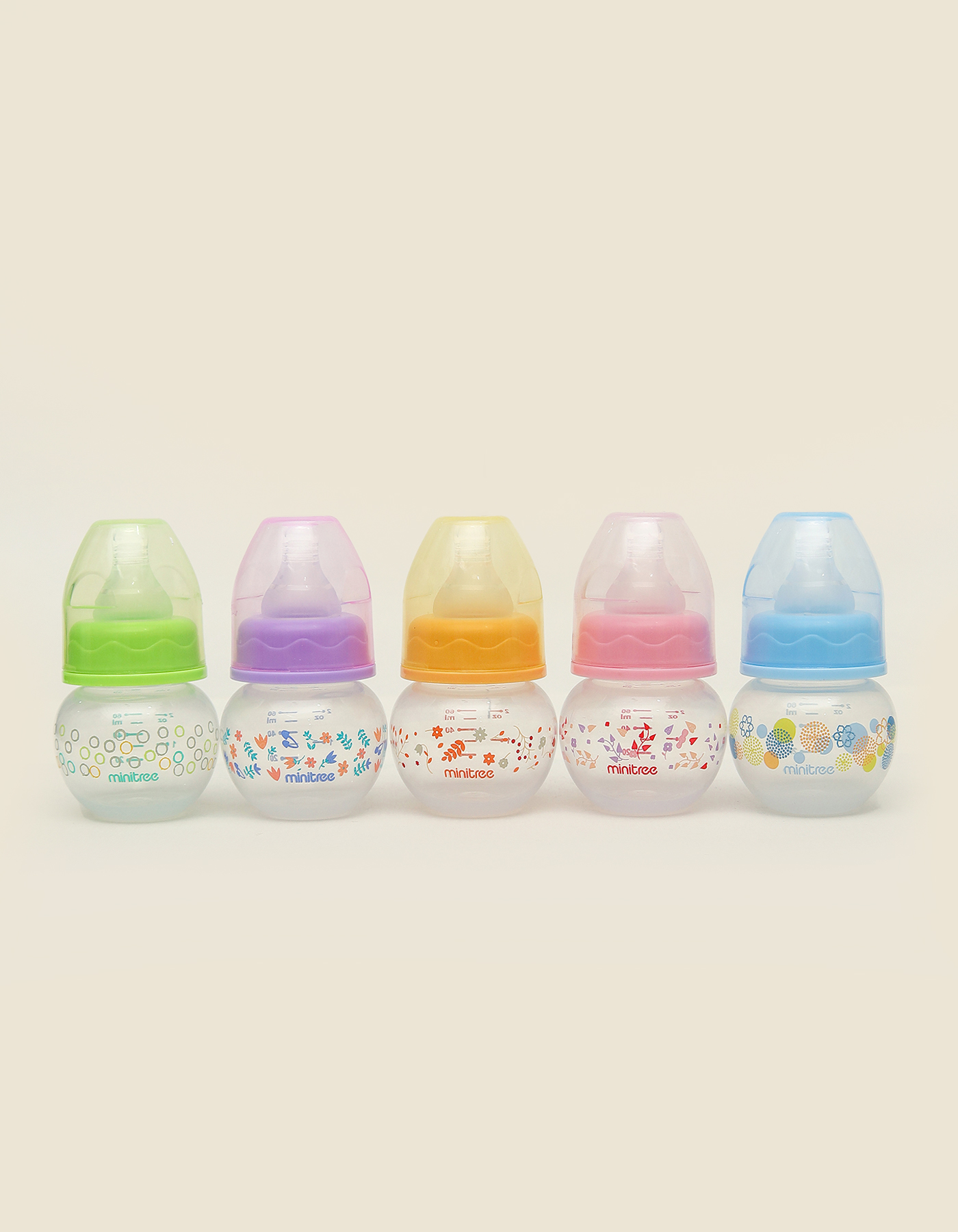The Minitree Colorful Prints Baby Feeding Bottles are designed to provide a safe, comfortable, and enjoyable feeding experience for your little one. With their round, compact shape and brightly colored lids (green, purple, yellow, pink, and blue), these bottles are both practical and fun for babies and parents.