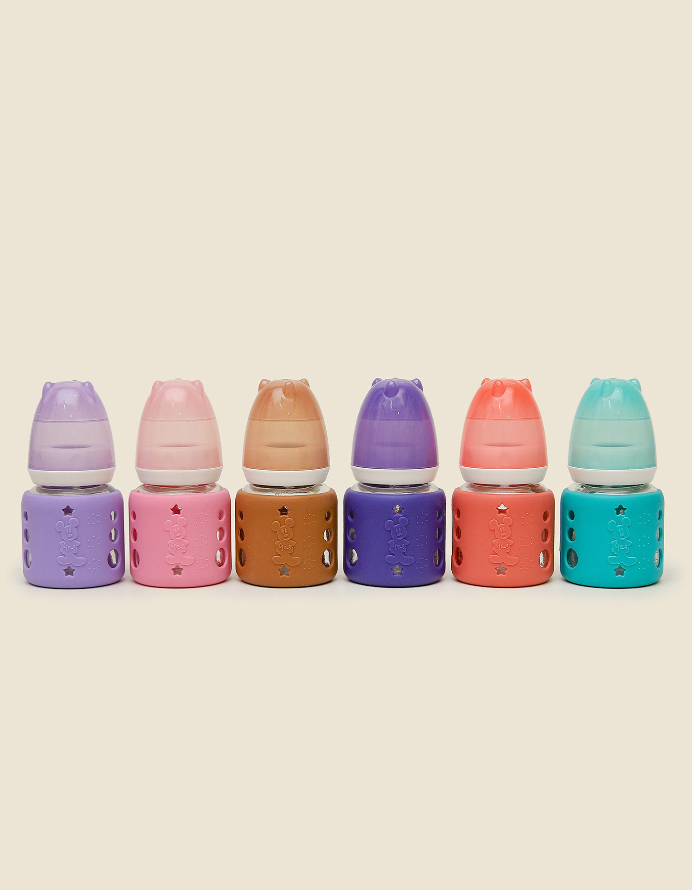 The Minitree Bear Silicone Sleeve Glass Feeding Bottles are designed to make feeding time both safe and fun. Each bottle comes with a protective silicone sleeve featuring a cute bear design and star cutouts for extra grip, paired with an adorable cap shaped like bear ears. Available in a delightful range of colors lavender, pink, brown, purple, coral, and aqua these bottles brighten up every feeding session.