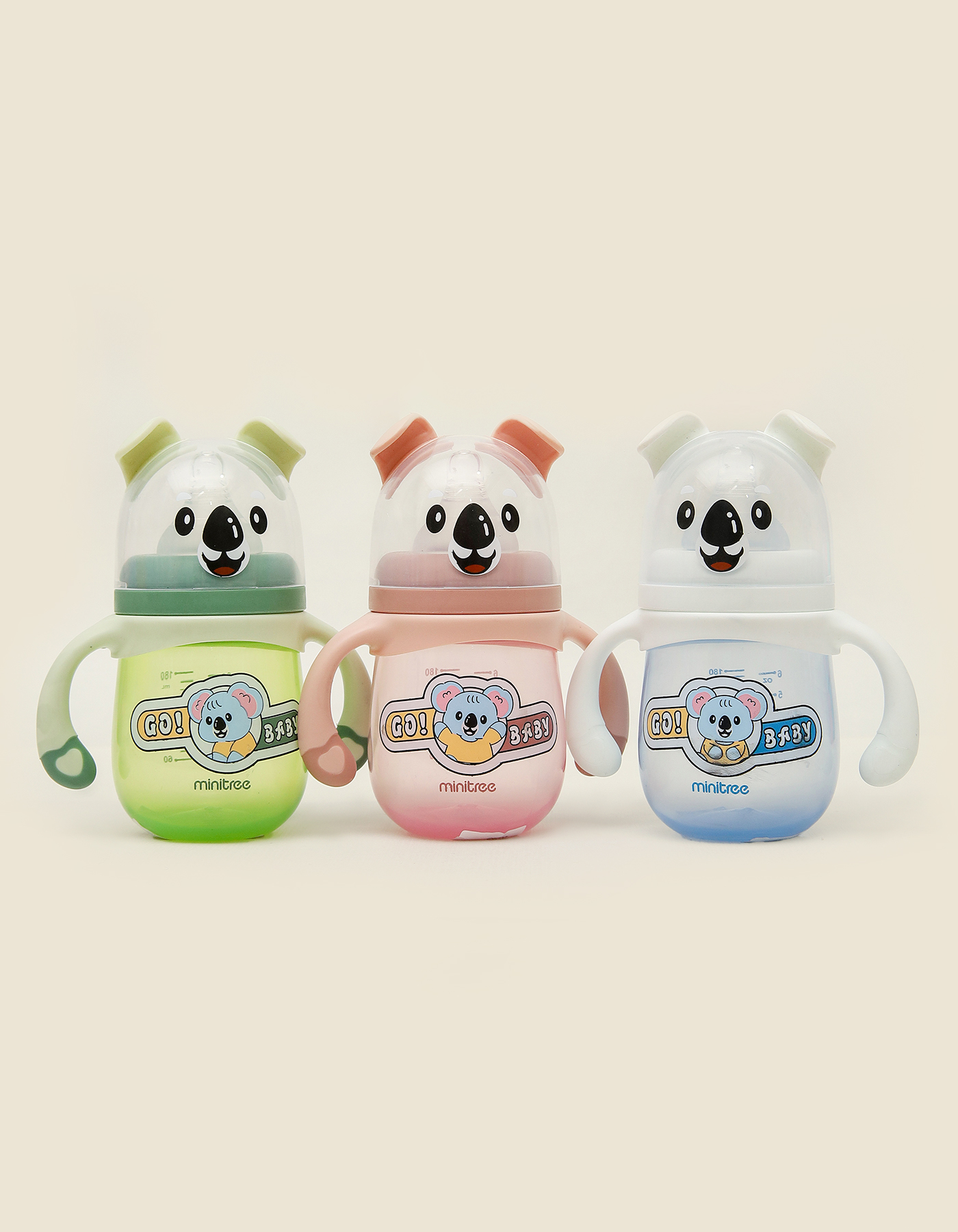The Minitree Go! Baby Koala Training Sippy Cups are designed to make the transition from bottle to cup safe, easy, and fun for toddlers. Featuring adorable koala faces on the lids and playful “Go! Baby” koala prints on the cups, this series comes in three charming colors green, pink, and blue.