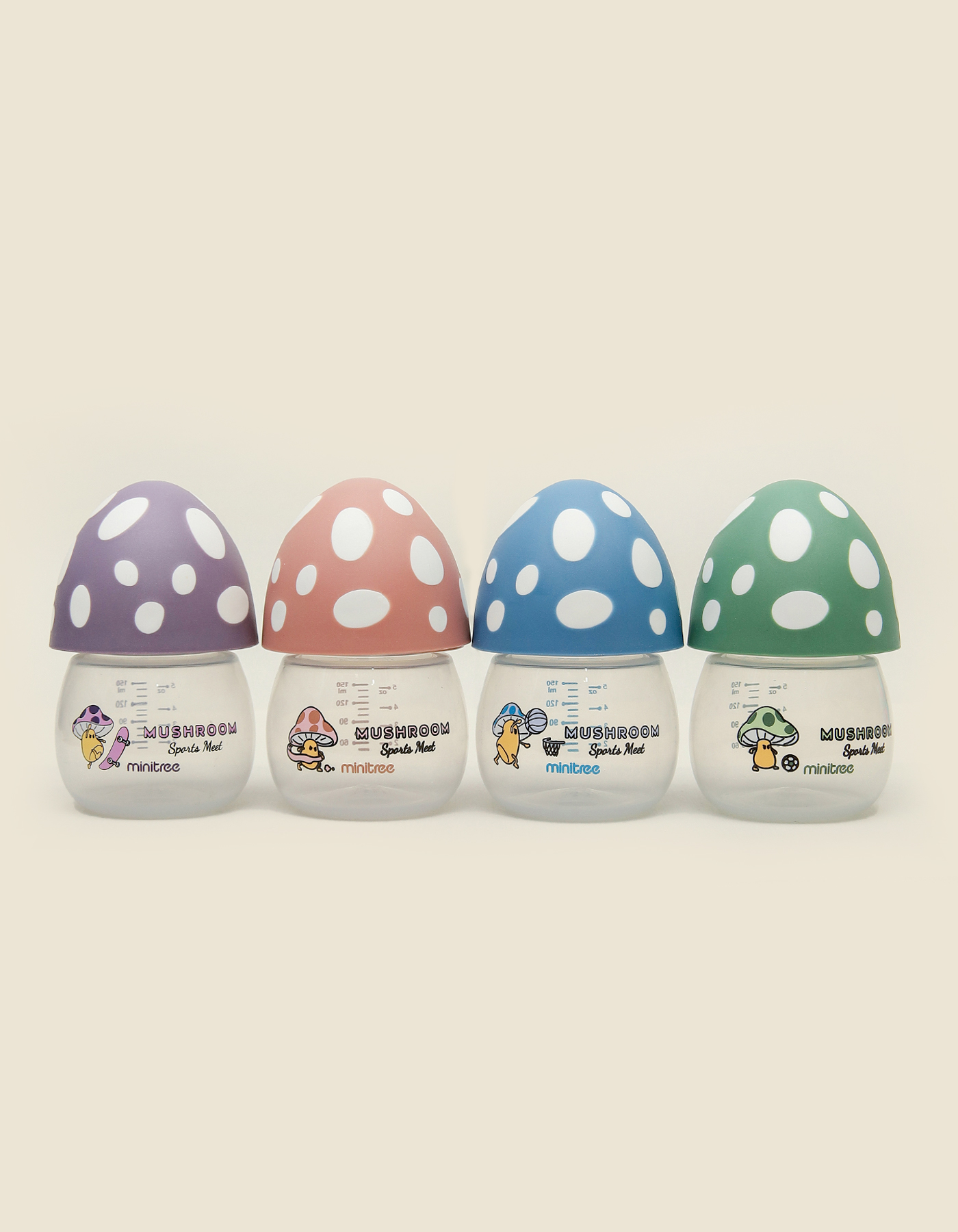 The Minitree Mushroom Sports Mate Feeding Bottles combine playful design with safe and practical feeding solutions for your baby. Featuring adorable mushroom-shaped lids with polka dots and fun character prints, these bottles come in four vibrant colors purple, pink, blue, and green making feeding time enjoyable and engaging.