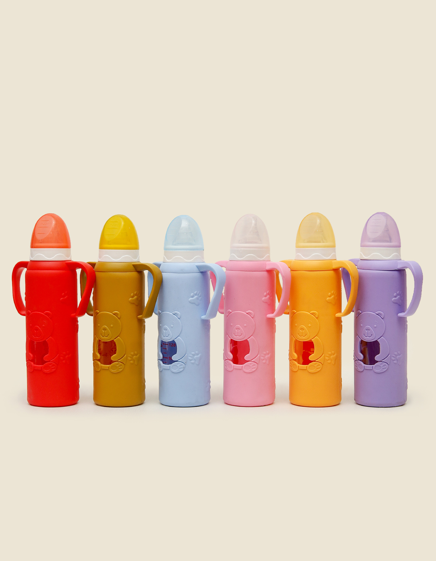 The Minitree Tall Bear Silicone Sleeve Glass Feeding Bottles are the perfect blend of safety, durability, and playful charm for your baby’s feeding routine. Each bottle features a protective silicone sleeve with an adorable embossed bear design and paw details, paired with dual side handles for easy grip. Available in red, mustard, blue, pink, orange, and purple, these bottles add color and fun to every feeding moment.